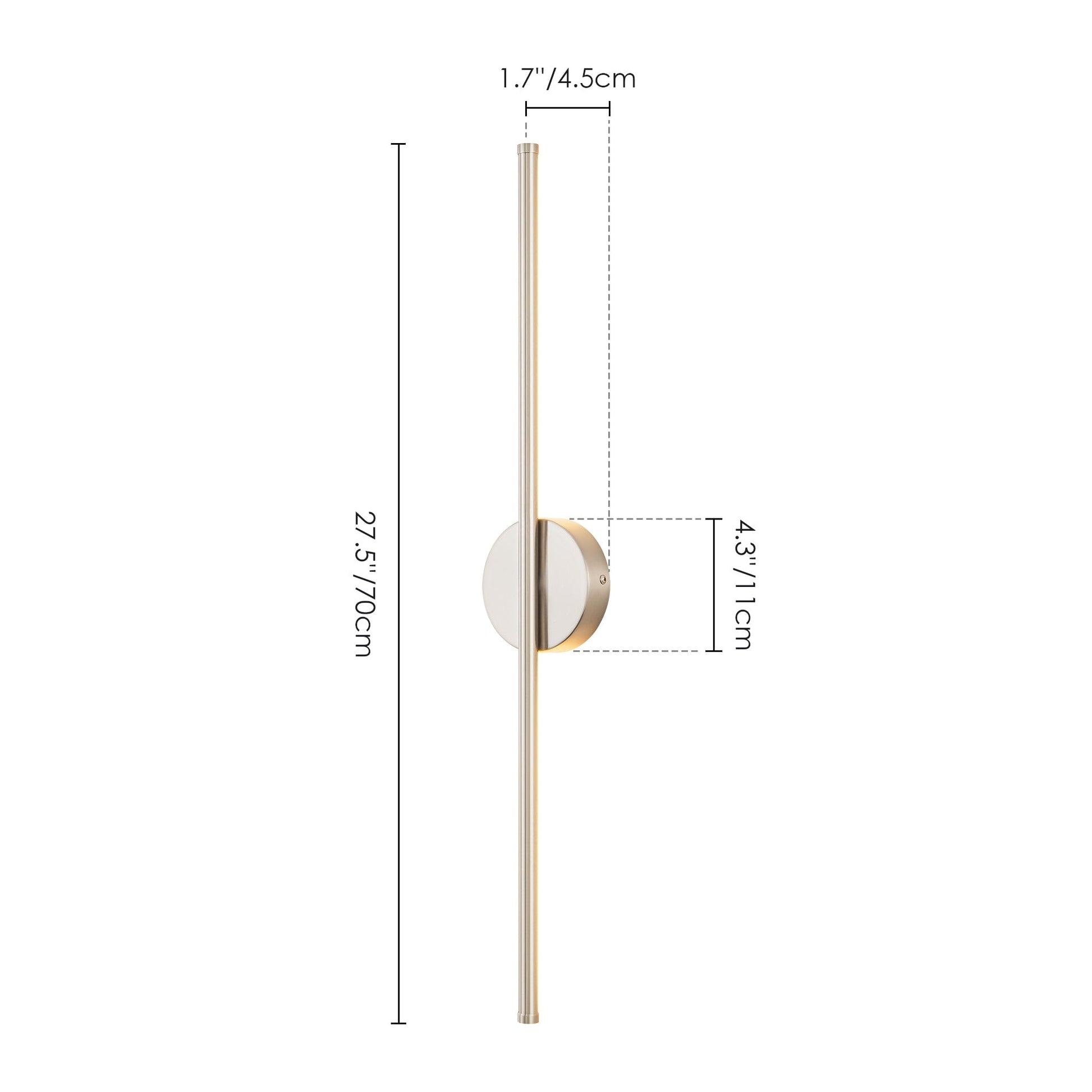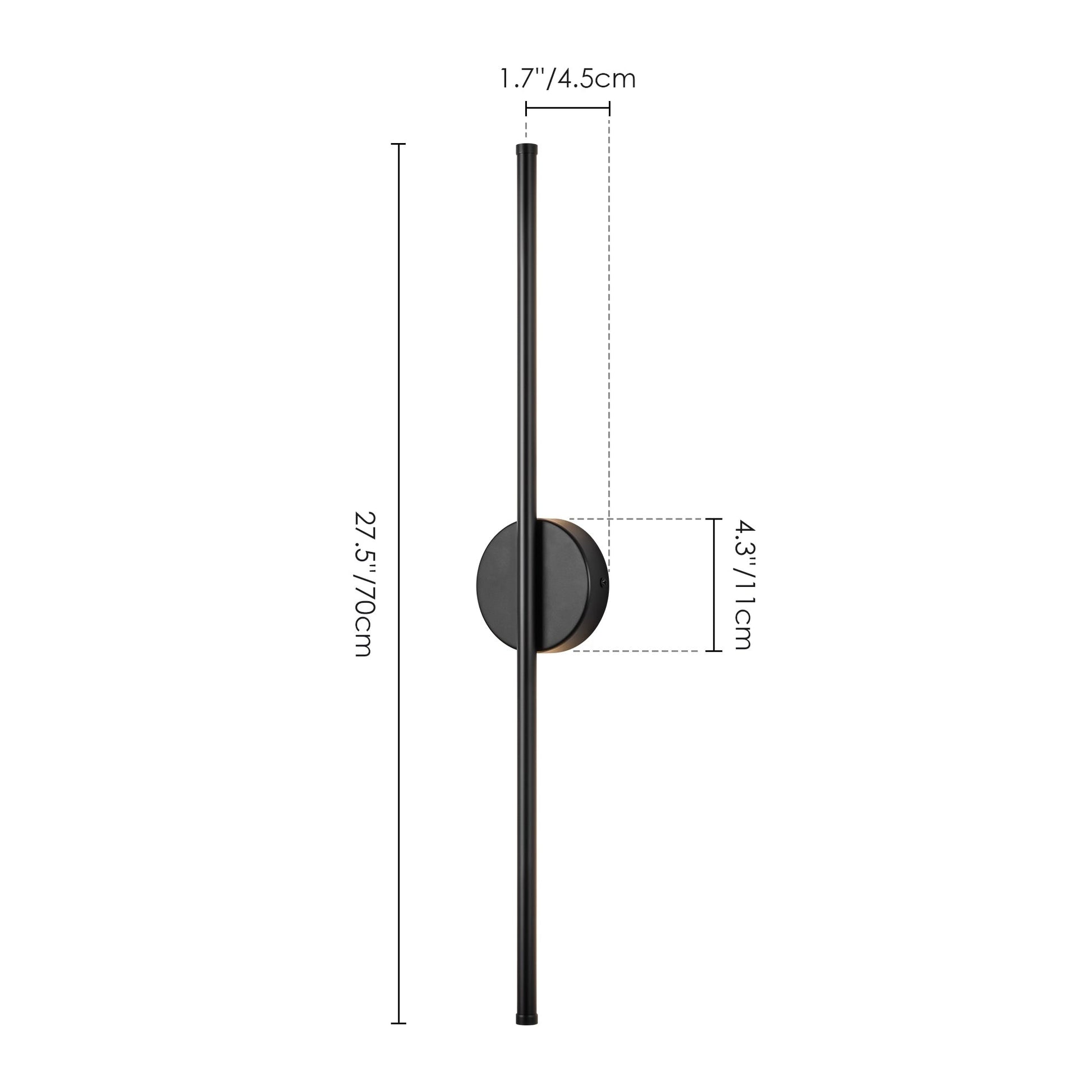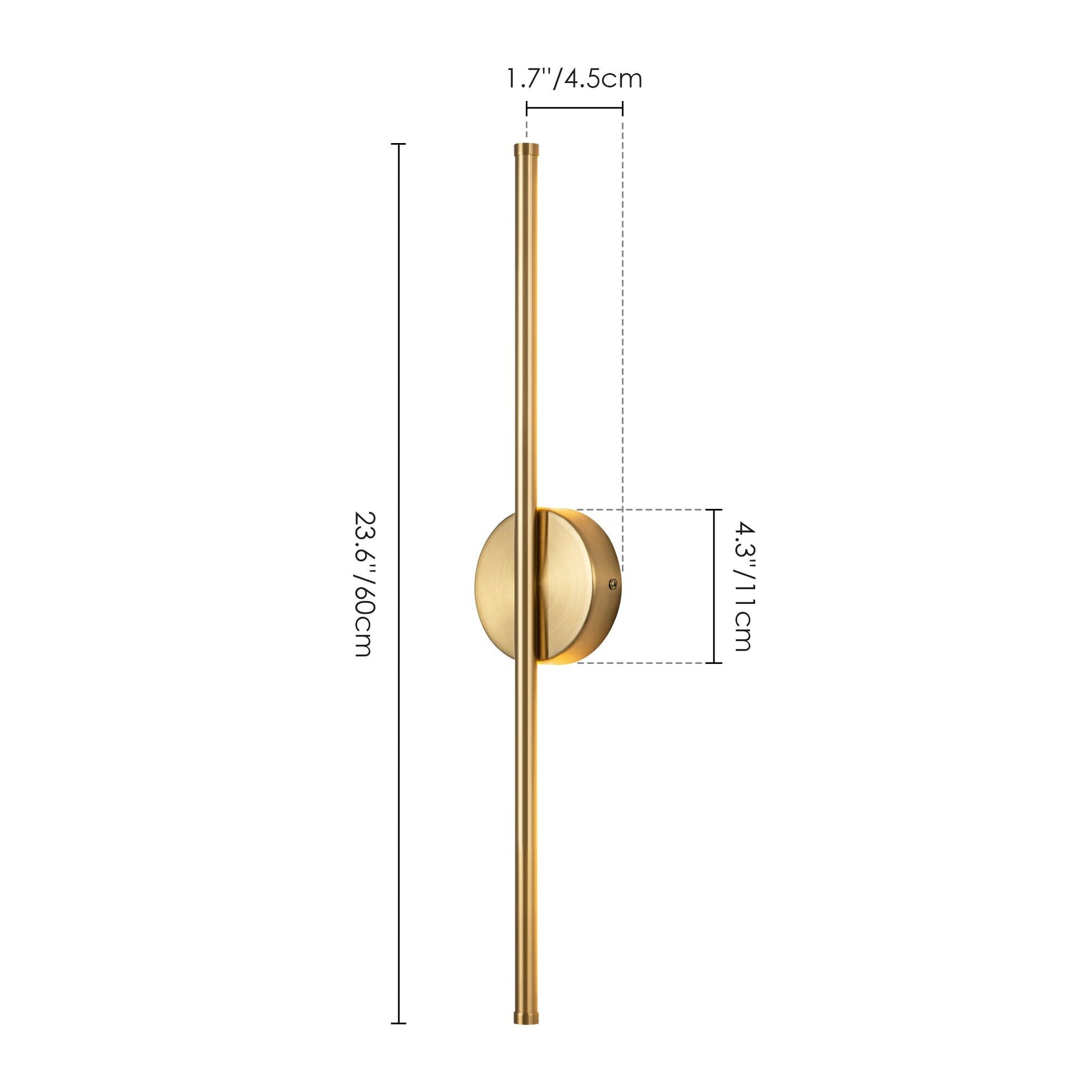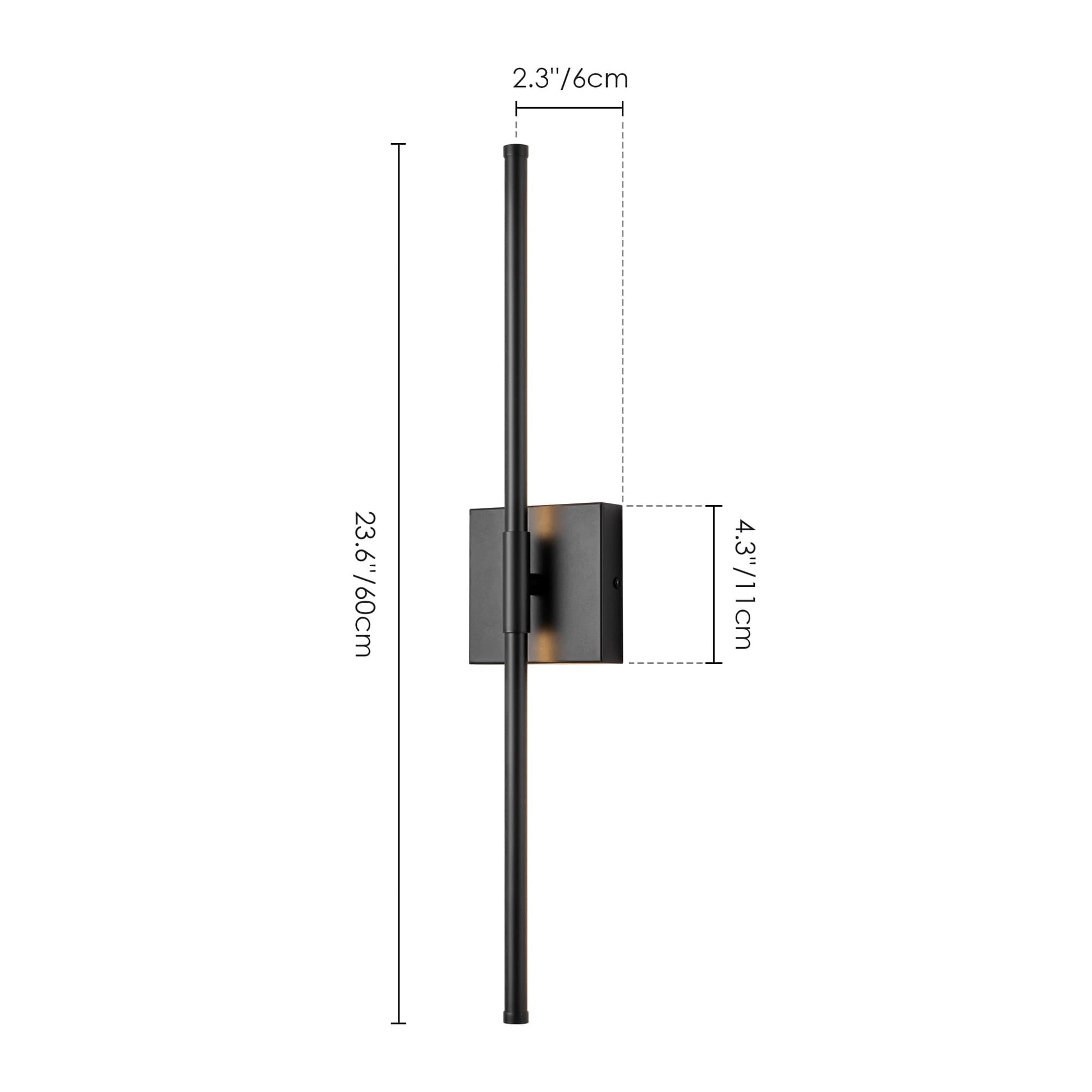 - Luminaire : 23,6 po L x 1,7 po H x 1,7 po P/ 23,6 po L x 2,3 po H x 2,3 po P (dépassant du mur)