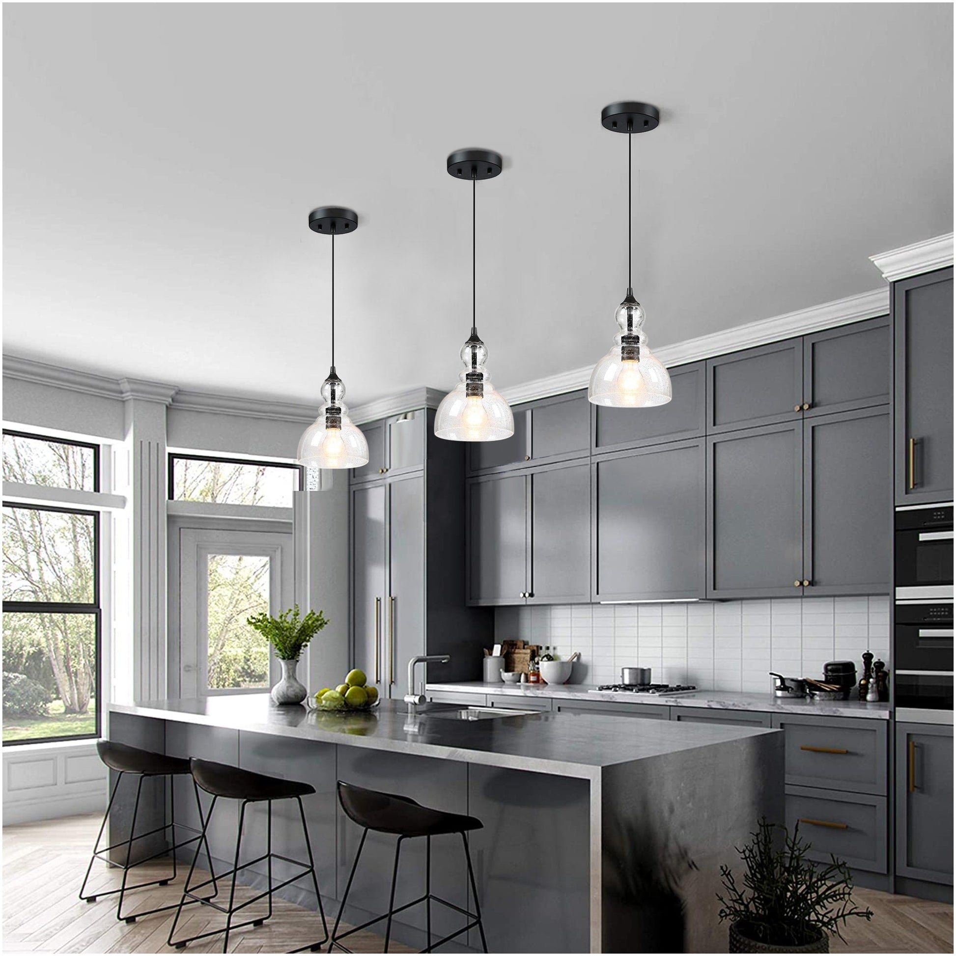 Lot de 3 suspensions en verre transparent pour îlot de cuisine, en métal et en verre. Avec leurs lignes épurées et leur design raffiné, elles s'intègrent parfaitement à votre intérieur. Leur abat-jour en verre transparent créera une atmosphère élégante et raffinée. Leur lumière douce et agréable est compatible avec tout type d'ampoule E26 (ampoule non incluse). Cette suspension en verre transparent est idéale pour une cuisine, un salon, une salle à manger, un bar, un café ou un restaurant.