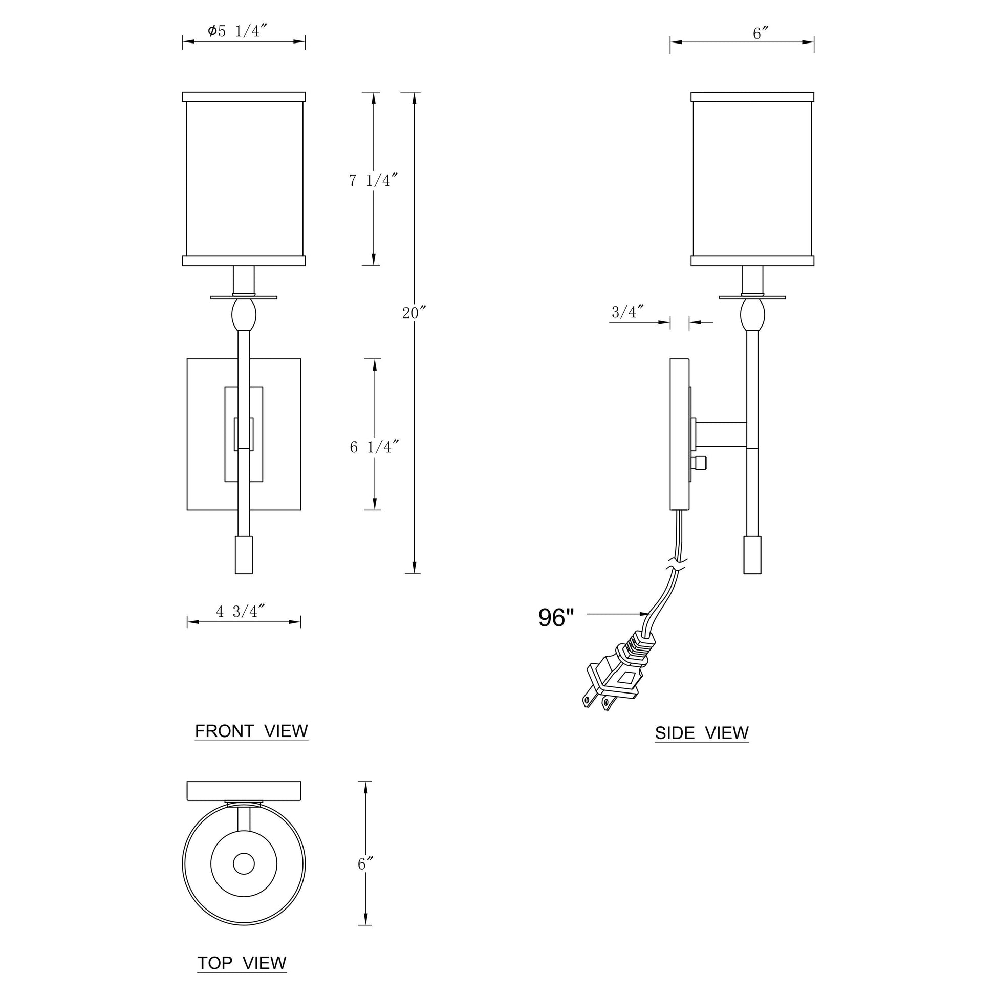 - Dimensions du produit : Le luminaire global mesure 20'' H x 5,25'' L x 6'' E, l'abat-jour en tissu mesure 5,25'' P x 7,25'' H, la plaque murale mesure 4,75' L x 6,25' H x 0,75' E, la longueur du cordon d'alimentation est de 8 pieds.