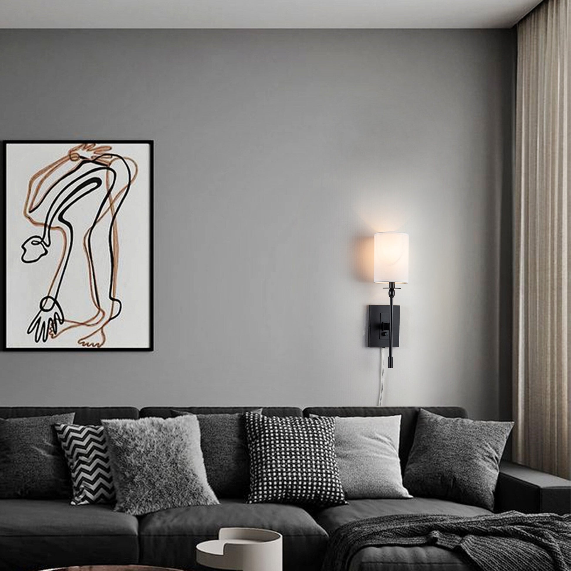 Applique murale d'intérieur à 1 ampoule, noire mate, câblée/enfichable, à intensité variable, avec abat-jour en tissu