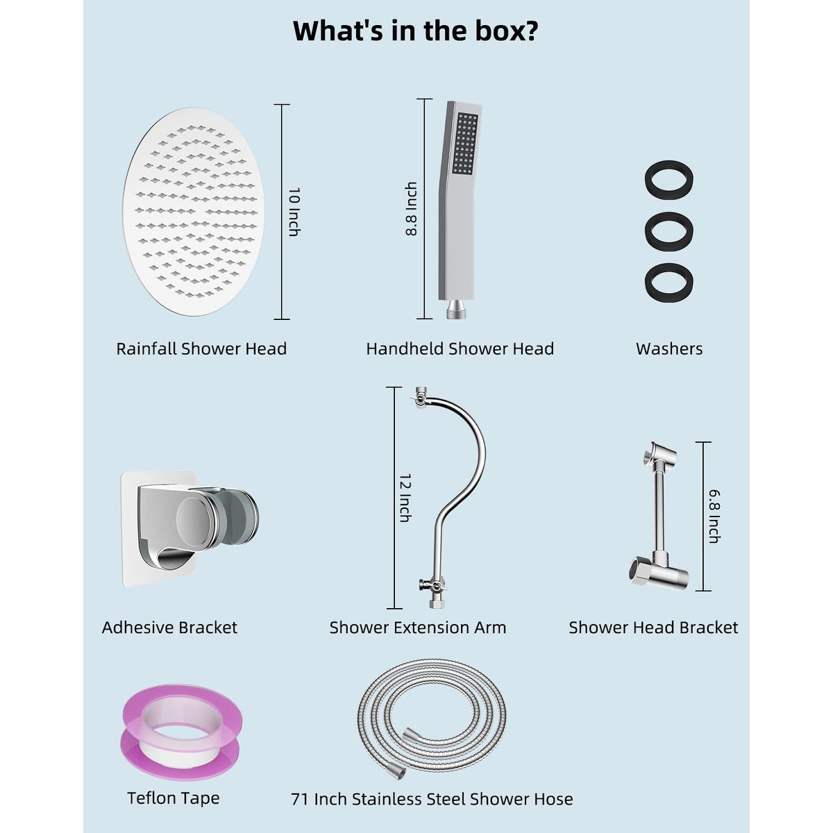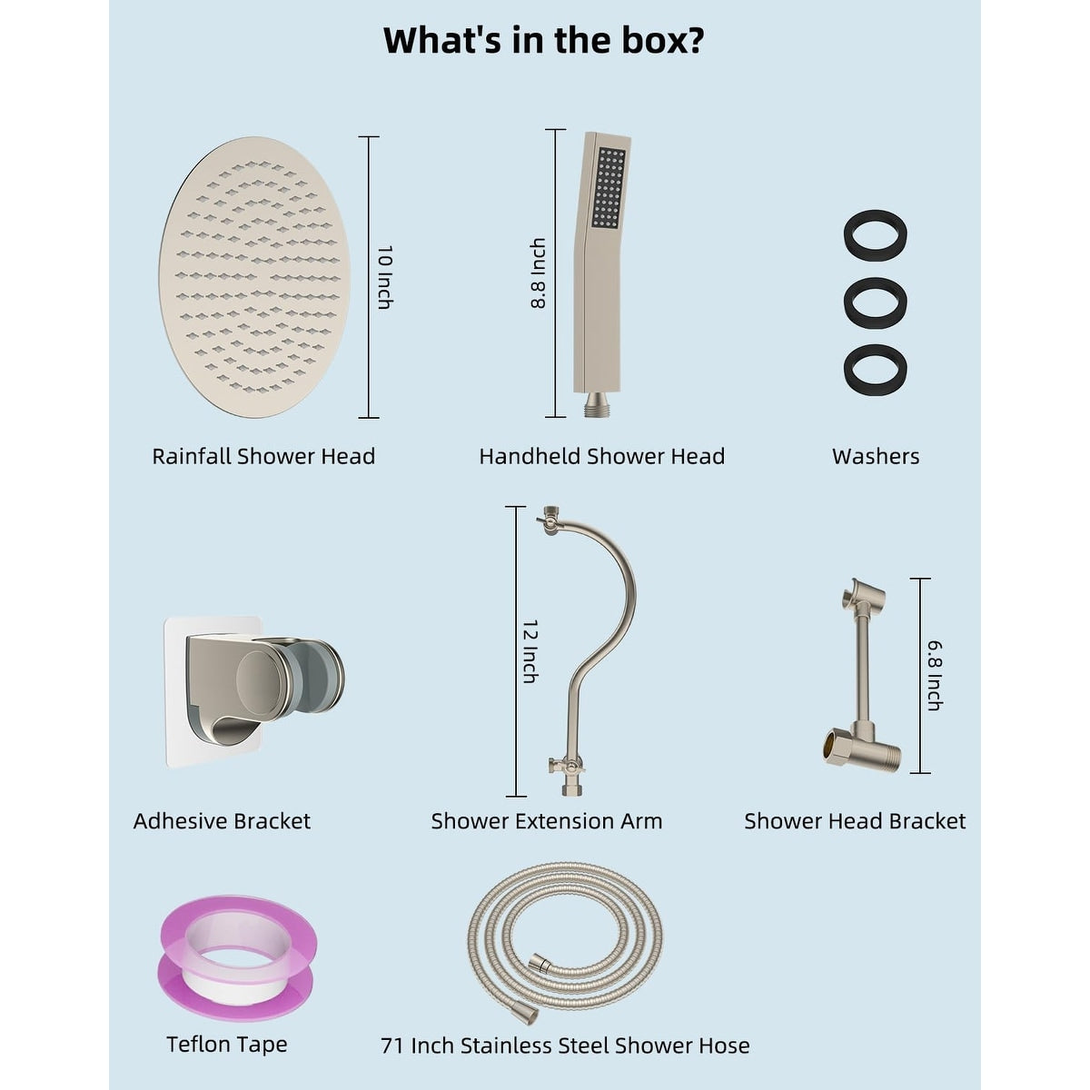- Ensemble pommeau de douche : Cet ensemble comprend un grand pommeau de douche rond effet pluie de 25 cm, une douchette, un flexible de 180 cm en acier inoxydable, un bras d'extension de 30 cm, un support adhésif, un support de pommeau, des rondelles, du ruban Téflon et un manuel d'installation. Fabriqué entièrement en acier inoxydable et en métal massif, le flexible extra-long de 180 cm est fabriqué en EPDM inodore, compatible avec les environnements à haute pression et haute température.