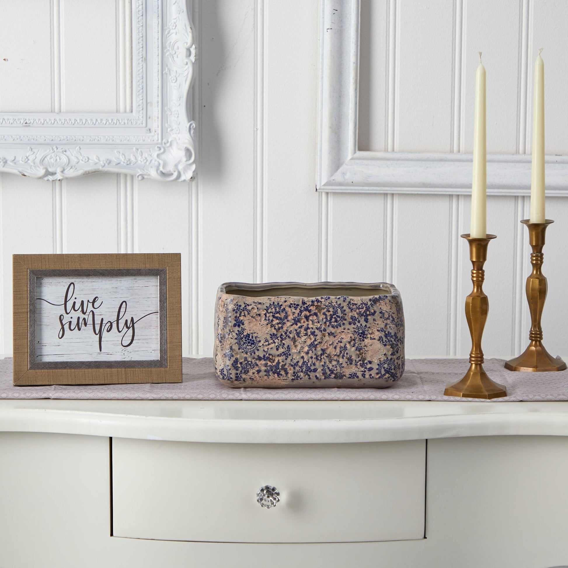 Disposez vos fleurs artificielles dans ce cache-pot rectangulaire à imprimé floral (lot de 1). Ce cache-pot vintage en céramique dégage une atmosphère chaleureuse avec sa palette de fleurs sur un fond brut. Amusez-vous à les assortir pour un look champêtre chic et frais, avec un style campagnard. Sans trou de drainage, pour un usage intérieur uniquement.