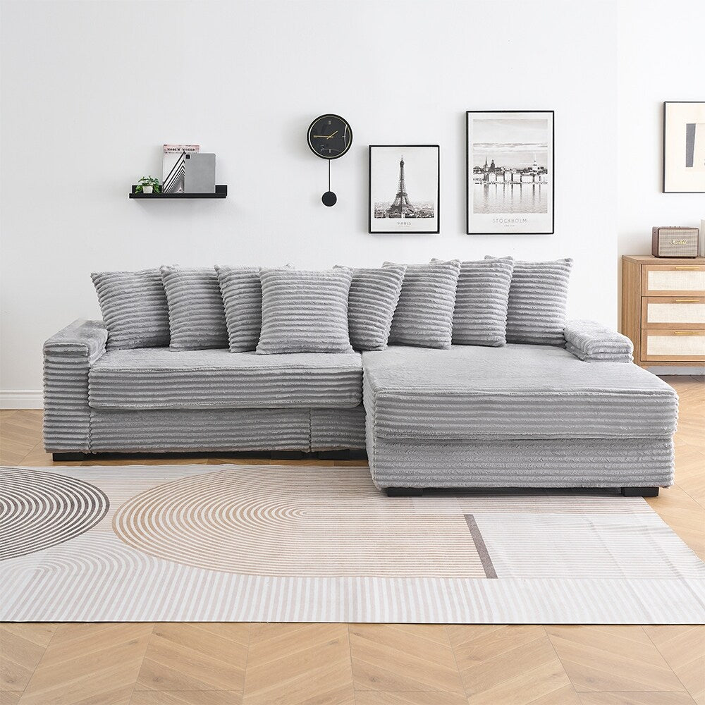 - This 111.4-inch flannelette L-shaped sofa combines modern design with cozy comfort, featuring soft corduroy fabric, high-density sponge filling, and eight plush throw pillows for a warm, inviting feel.