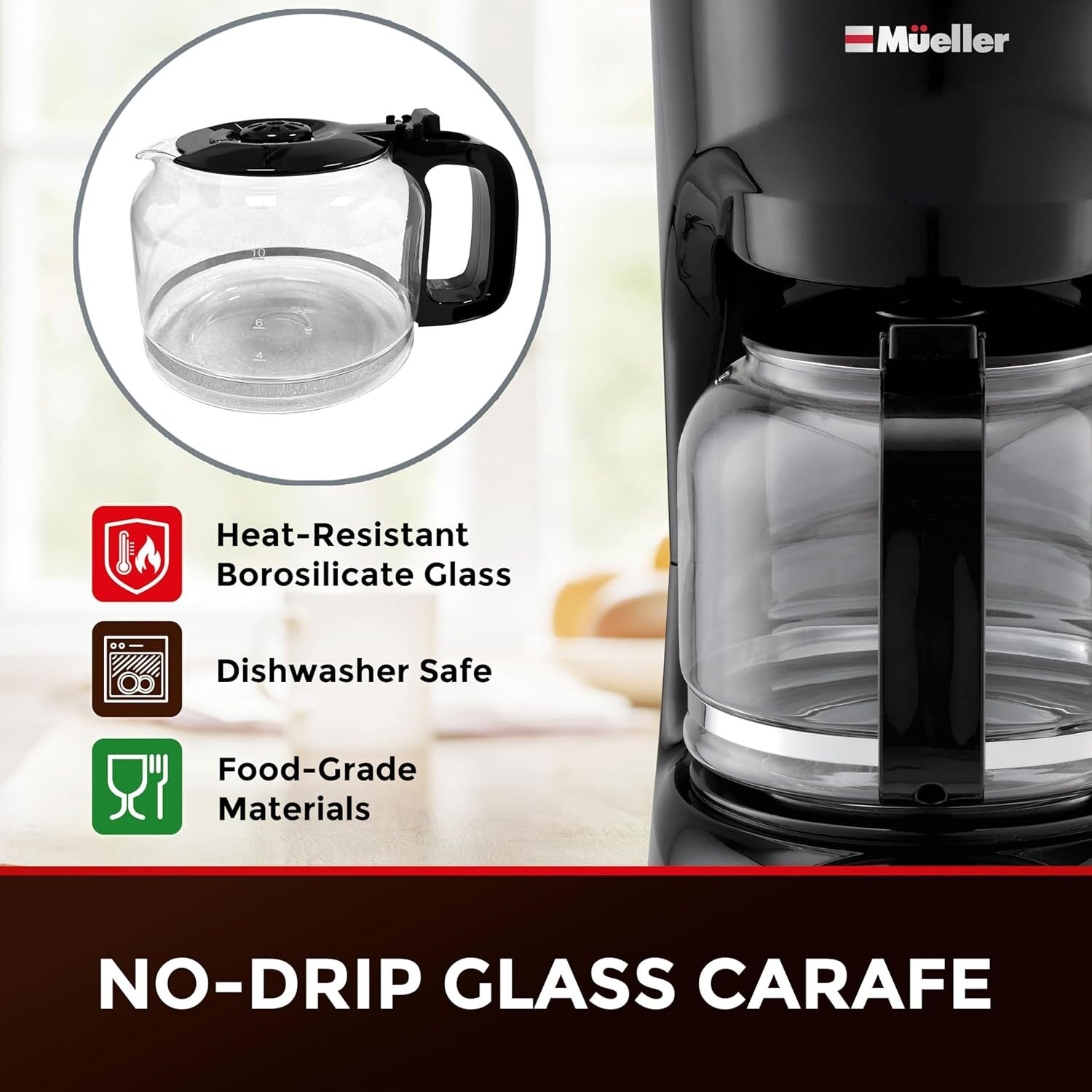 Grande capacité et conception durable : la carafe en verre d'une capacité de 1,7 litre vous permet de préparer jusqu'à 12 tasses de café, ou simplement d'en préparer 2 ou 4 à la fois. Sa poignée ergonomique permet un versement confortable et sans gouttes. Lavable au lave-vaisselle, cette carafe est fabriquée en verre borosilicate non poreux de haute qualité, qui n'absorbe pas les odeurs. Son excellente résistance à la chaleur permet de conserver votre café chaud plus longtemps. Filtre écologique réutilisable : notre technologie de filtre permanent enrichit la saveur de votre café et vous évite le coût et le gaspillage des filtres jetables. Facile à retirer et à nettoyer, vous pouvez néanmoins utiliser du papier filtre si vous le souhaitez. Savourez chaque remplissage. Maintien au chaud amélioré : notre fonction de maintien au chaud maintient la température de votre café, garantissant que votre dernière tasse soit aussi chaude que la première. Une fois votre machine préparée, la plaque chauffante conserve la chaleur et s'éteint automatiquement au bout de 2 heures. Idéal pour les matins pressés ou les brunchs tranquilles. (*Non compatible avec les appareils intelligents.) Fonctionnalités bien pensées : La machine à café Mueller est équipée d'une verseuse anti-goutte et de pieds antidérapants pour une meilleure stabilité, garantissant une préparation propre et sûre. Qualité supérieure avec Mueller : nous vous proposons des produits de la plus haute qualité, conçus pour vous simplifier la vie. Besoin d'aide ? N'hésitez pas à nous contacter.