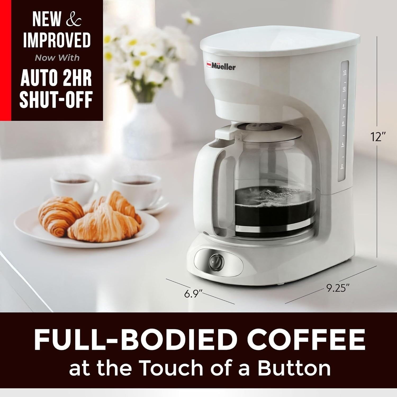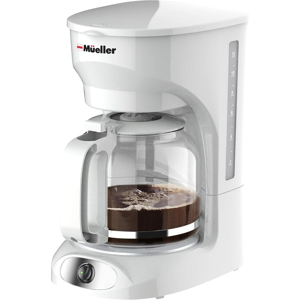 Cafetière blanche 12 tasses avec carafe en borosilicate, arrêt automatique, filtre réutilisable et fenêtre transparente