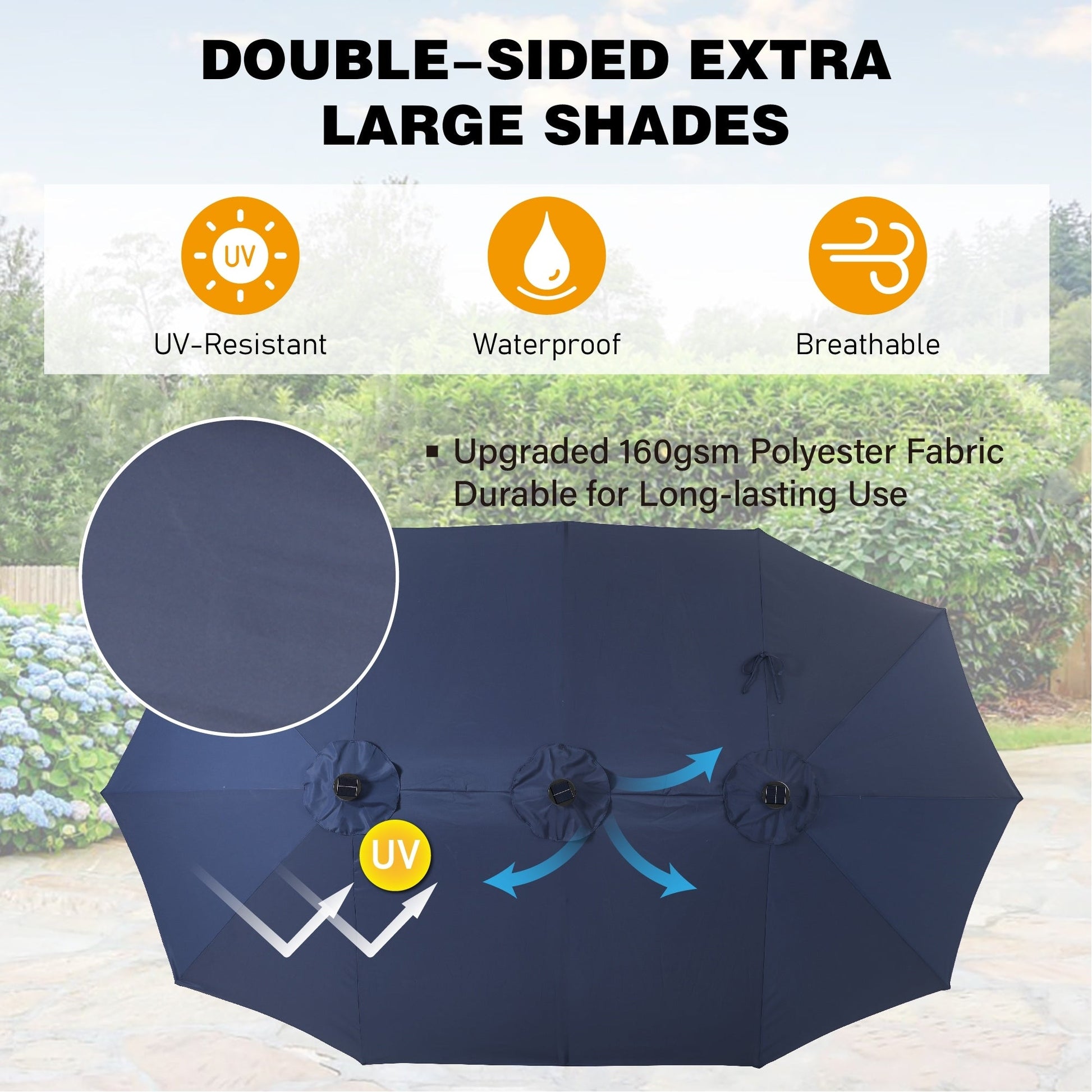 Parasol de marché extérieur rectangulaire à manivelle double face de 15 pieds, parasol de patio éclairé par LED solaire avec base incluse