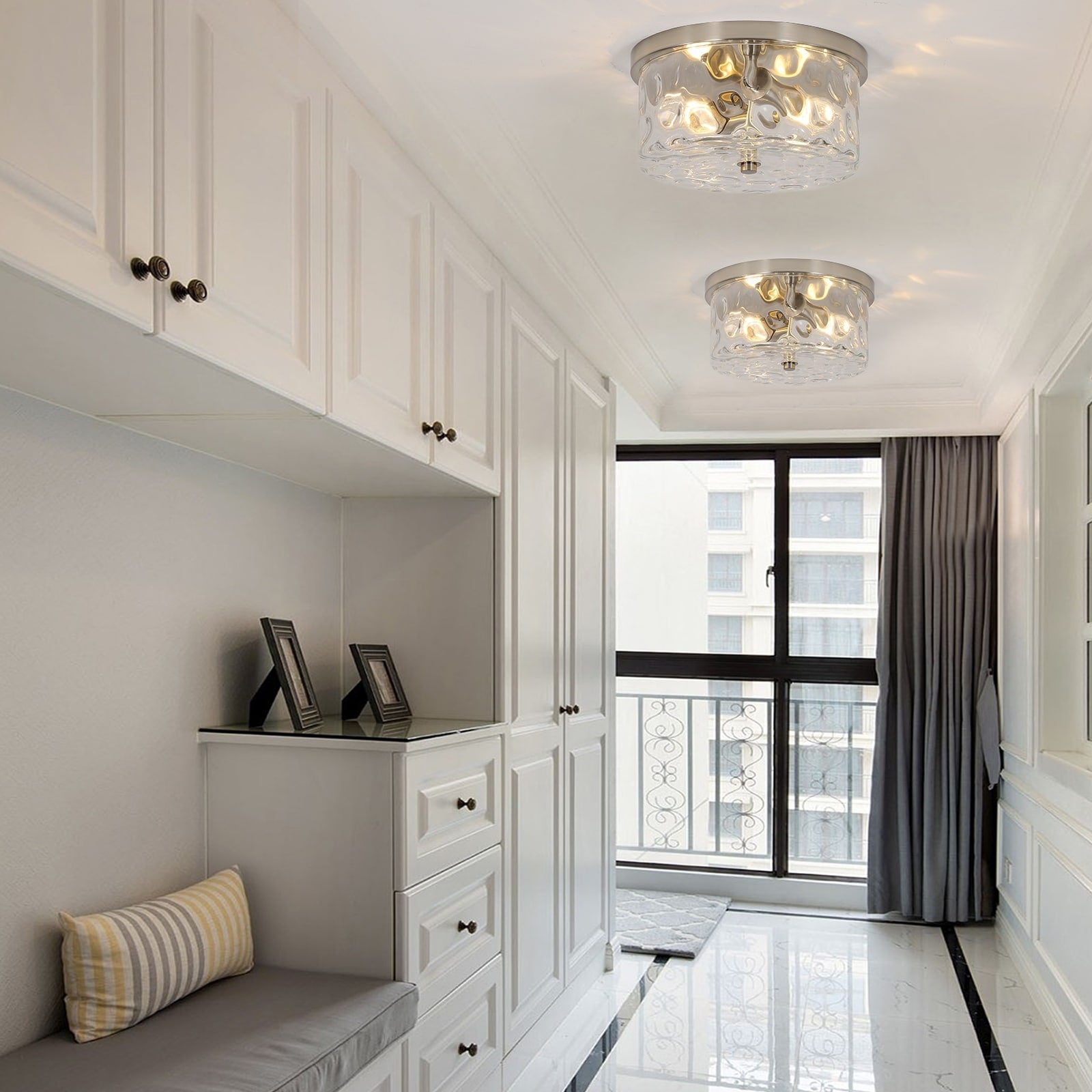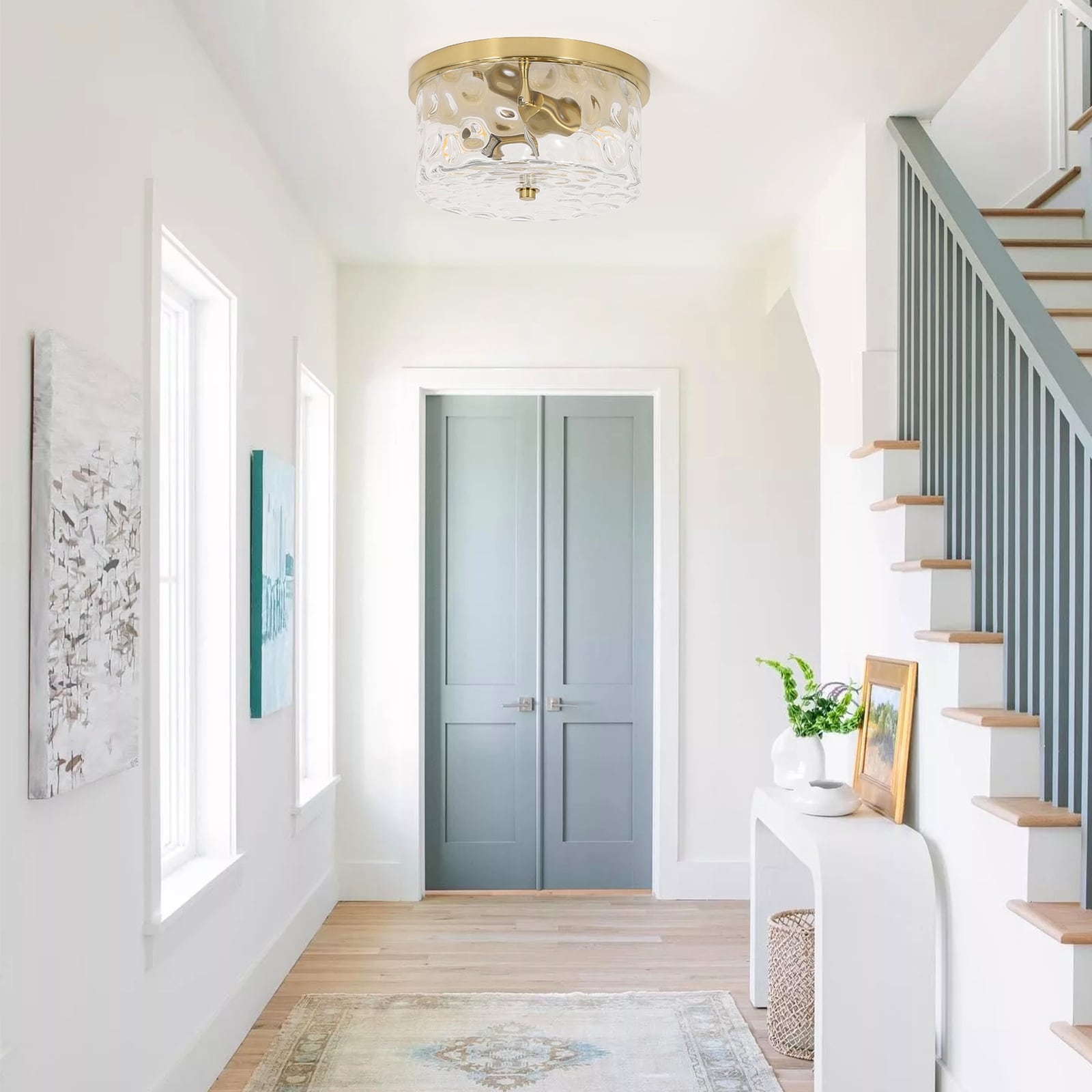 Ce plafonnier est composé d'une base en métal robuste recouverte d'un délicat abat-jour en verre martelé. Il diffuse la lumière plus loin et plus fort, donnant aux deux lampes un aspect plus vif et vintage. Ce luminaire est câblé et comprend le matériel de montage nécessaire pour une installation rapide et facile. Il est idéal pour les couloirs, les escaliers, les entrées, les cuisines, les chambres, les salles de bains et autres espaces de décoration.