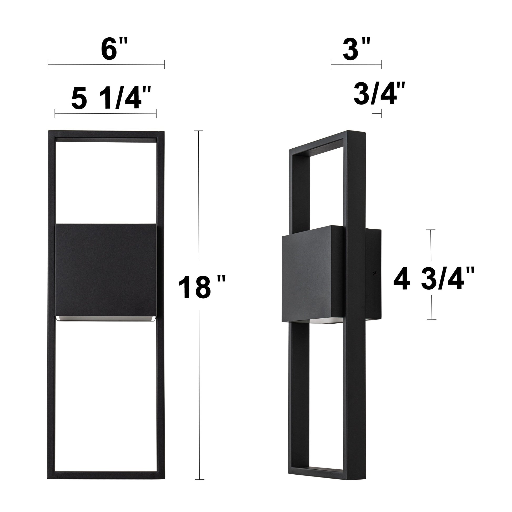 - Le luminaire mesure 6 po de largeur x 3 po d'épaisseur x 18 po de hauteur, la plaque murale mesure 5,25 po de largeur x 0,75 po d'épaisseur x 4,75 po de hauteur.