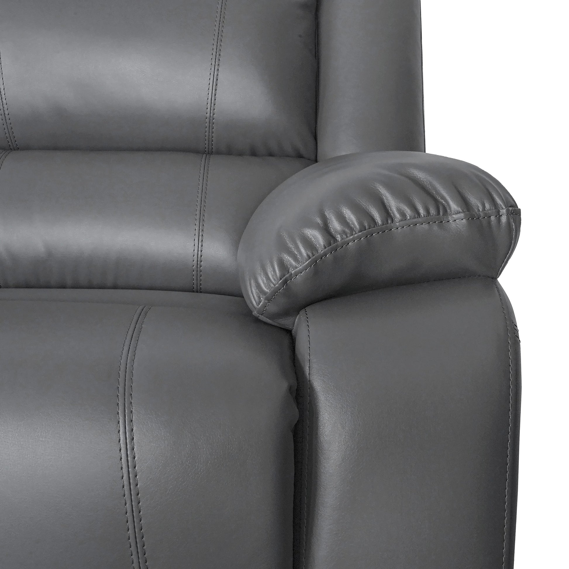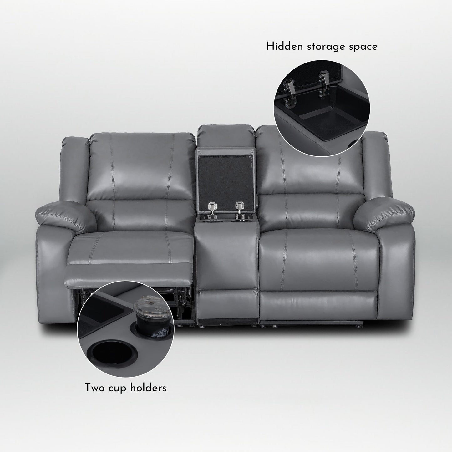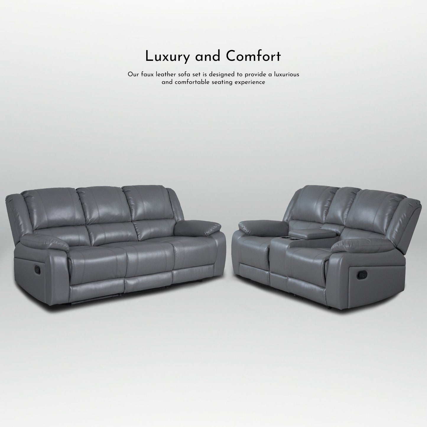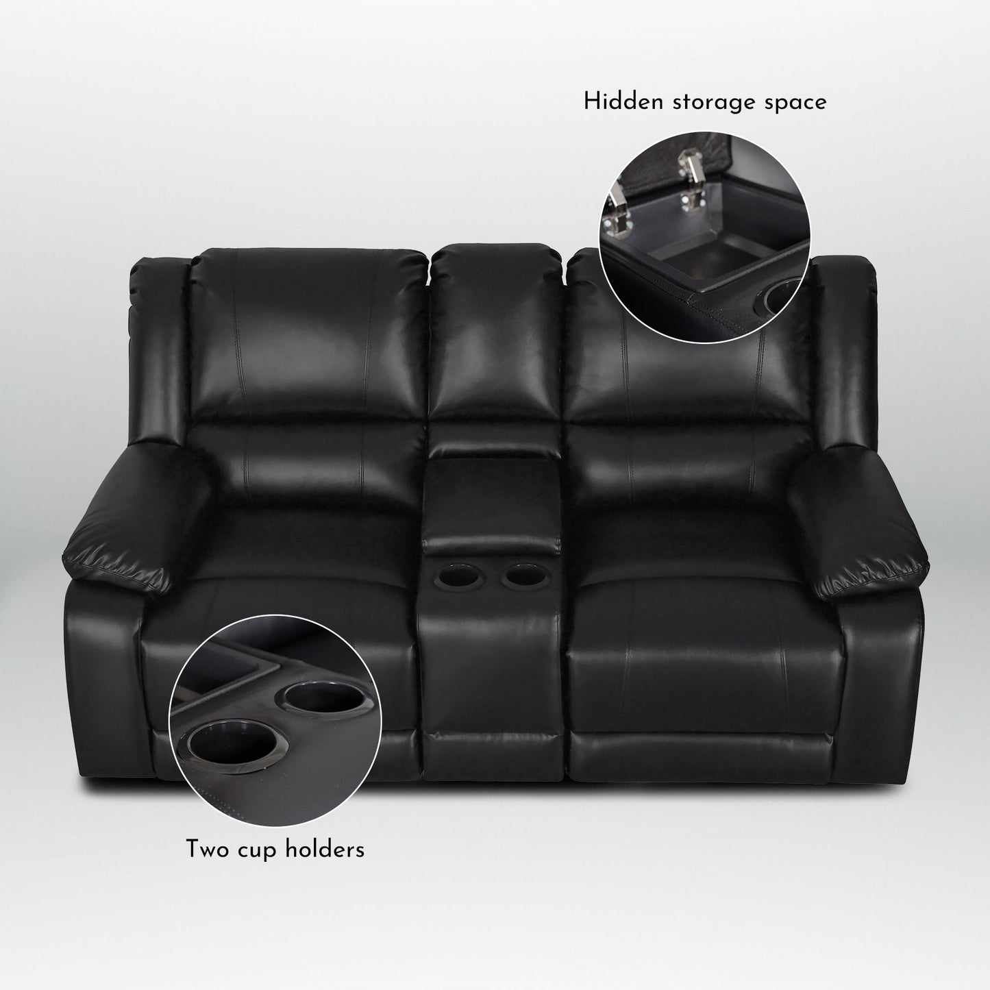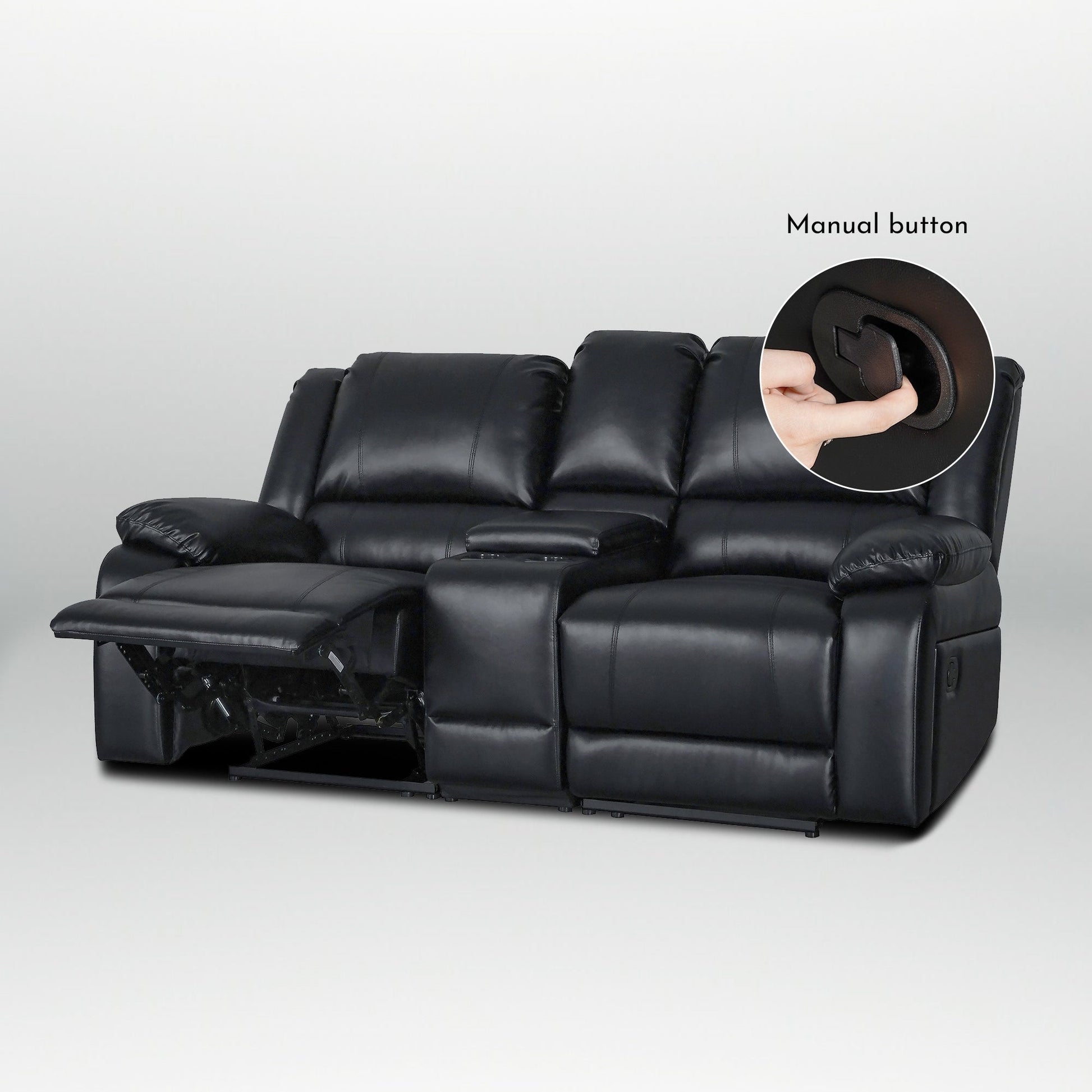 Add a touch of modern style to your living room with this stunning manual recliner sofa set. Upholstered in the finest faux leather, this couch offers a comfortable and cozy seating experience for you and your guests. Featuring a sinuous spring with foam for extra cushioning, this sofa set is perfect for watching movies or relaxing with a good book. The recliner mechanism provides even more comfort, with a single recliner on each end. This contemporary living room set is a trendsetter in every regard and is sure to impress.The loveseat contains a single recliner on each end,1 center console for easy storage with 2 built-in convenient cup holders.