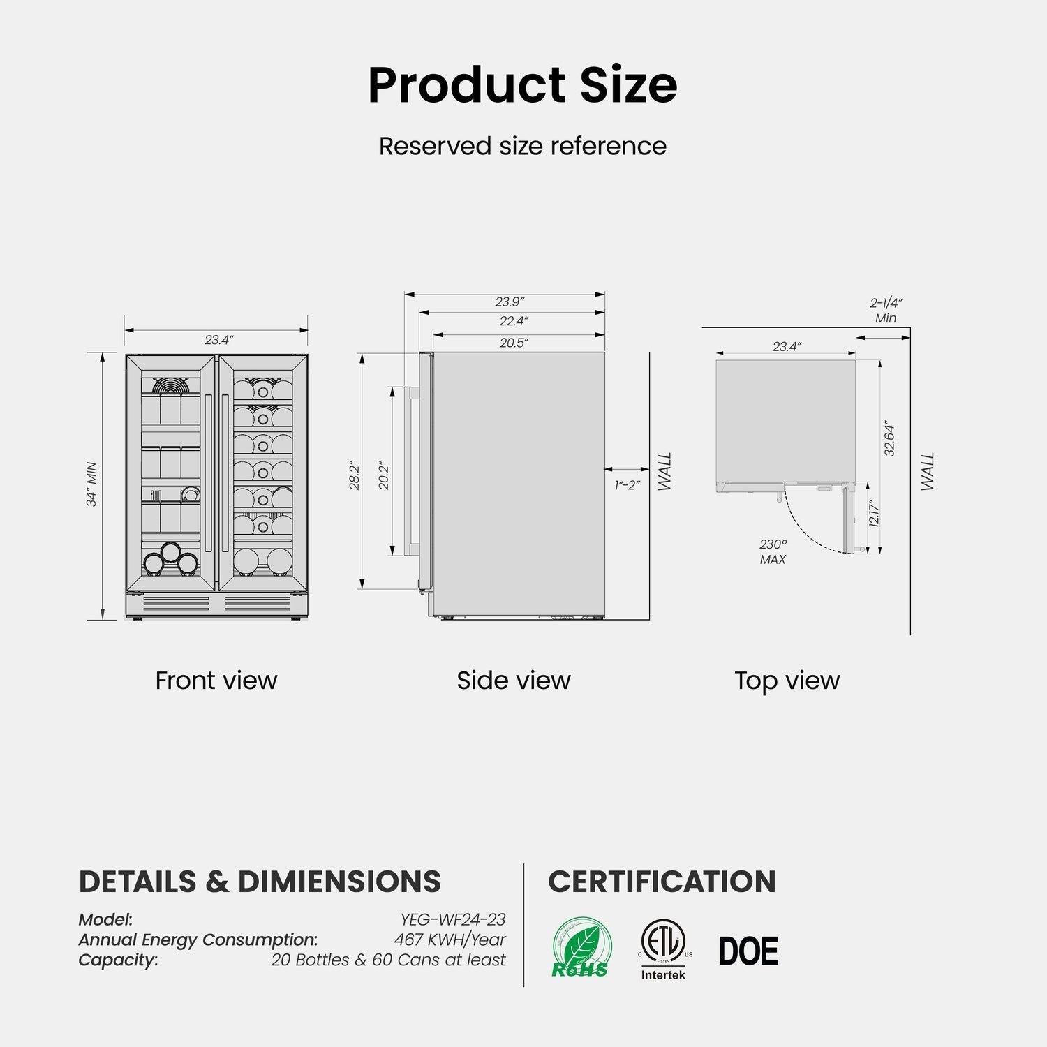 Réfrigérateur à vin/boissons 24 pouces, réfrigérateur double zone pour 20 bouteilles/60 canettes - 24 pouces