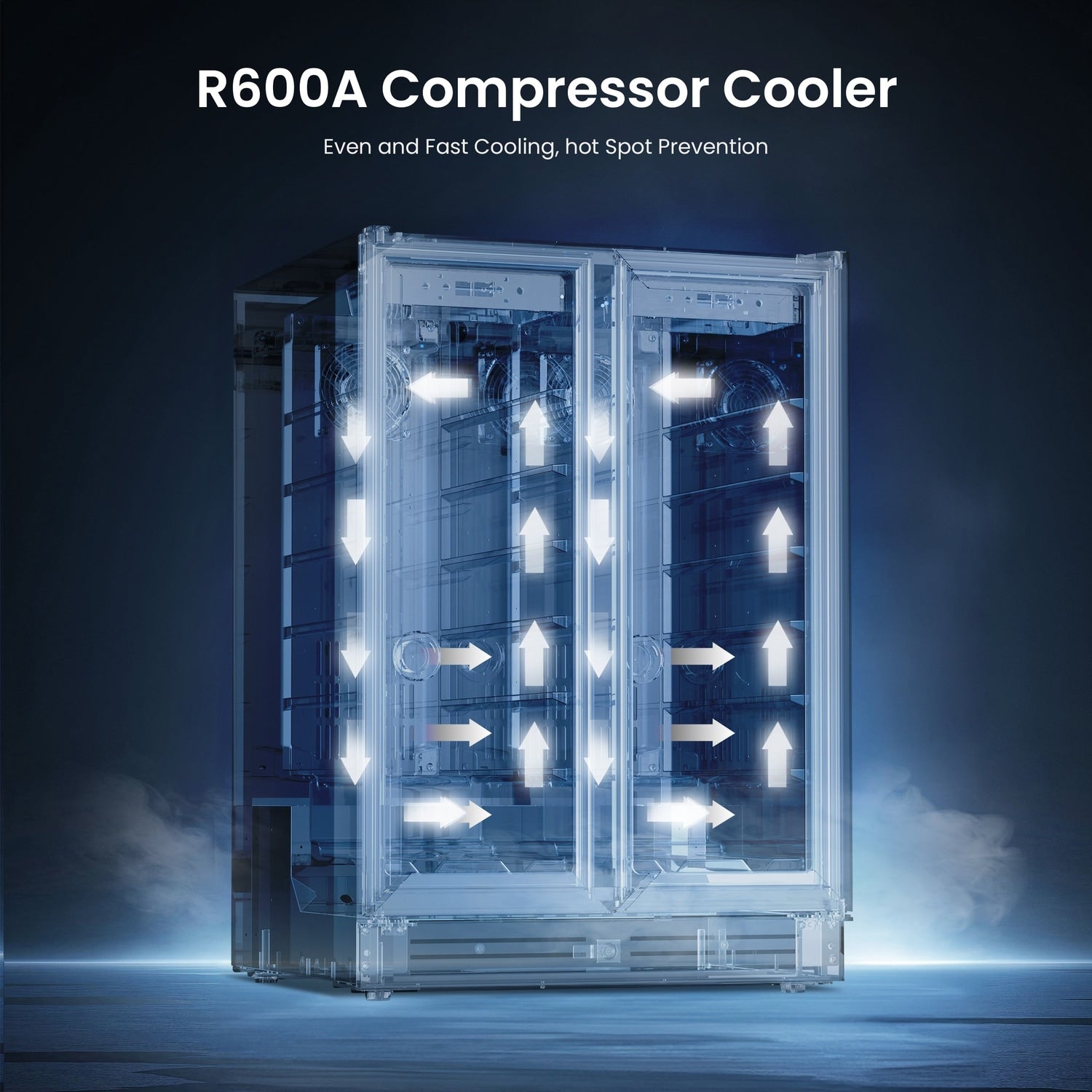 - Refroidissement écologique et efficace : Doté du réfrigérant R600a et certifié DOE, le refroidisseur à vin et boissons Yeego offre un refroidissement rapide et homogène tout en économisant de l'énergie. Son système de ventilation frontale améliore la circulation de l'air et la dissipation de la chaleur, tandis que le filtre à charbon actif élimine les odeurs, préservant ainsi la fraîcheur de l'intérieur.
