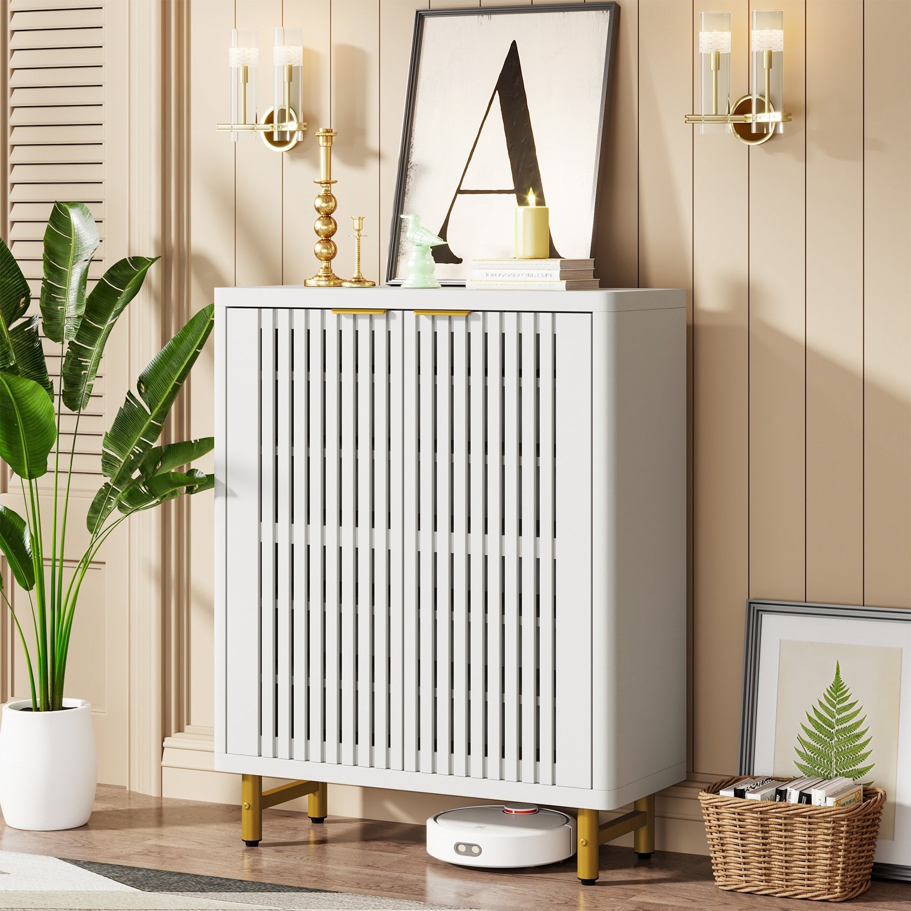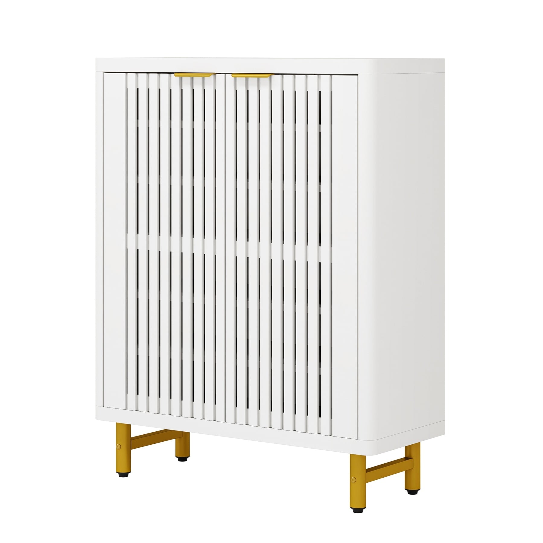 Incarnez l'essence même du design moderne et du confort avec notre meuble à chaussures 2 portes. Ses portes, finement travaillées, arborent un motif rayé creux qui ajoute à l'élégance générale du meuble. Derrière les portes se cachent cinq étagères spacieuses et réglables, idéales pour ranger vos chaussures. Fabriqué en bois d'ingénierie durable et soutenu par des pieds en métal robuste, ce meuble à chaussures est conçu pour durer. Ses dimensions hors tout (P 35,5 cm x l 9,6 cm x H 11,1 cm) en font un meuble idéal pour tous les espaces. L'emballage comprend des patins et une notice de montage facile à comprendre.