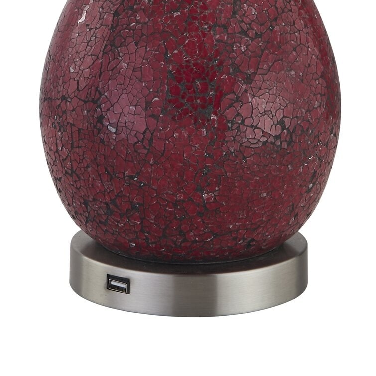 Ce lot de deux lampes de chevet illumine votre espace avec une texture ludique et une touche bohème. Elles sont toutes deux conçues en forme de goutte avec un effet craquelé unique rappelant le verre au mercure. Leurs bases métalliques circulaires sont équipées de ports USB intégrés, parfaits pour recharger votre téléphone ou votre tablette pendant que vous lisez ou regardez la télévision. L'abat-jour tambour sobre et le fleuron confèrent à la lampe un aspect vraiment fantastique. Chaque lampe fonctionne avec une ampoule standard (non incluse).