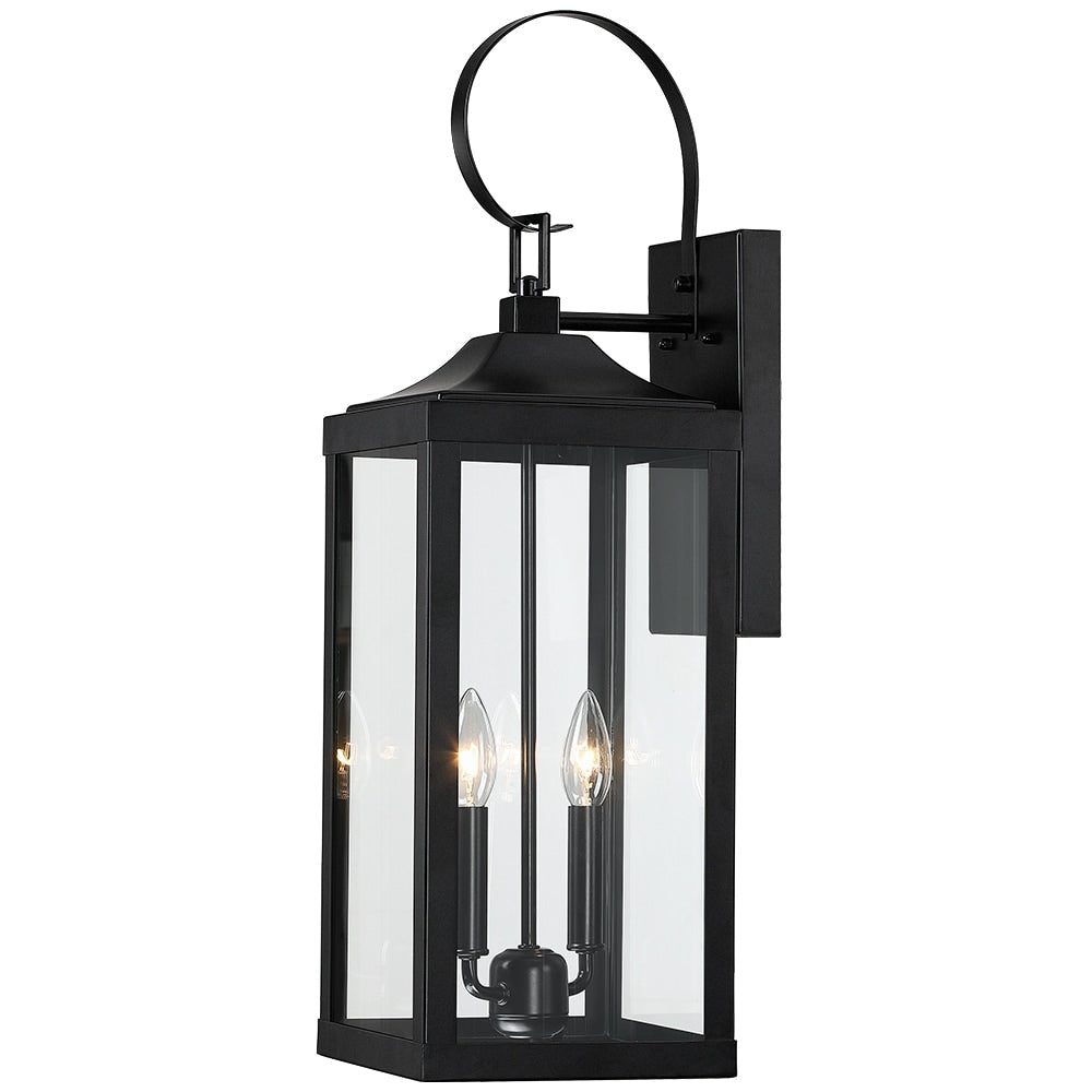 Illuminez votre porte d'entrée ou votre garage avec cette lanterne d'extérieur classique à 2 lumières, nouvelle tradition. Conçue pour les endroits humides, sa structure élégante en métal noir mat s'harmonise avec votre décoration, du classique au rustique. Elle est composée de 4 panneaux de verre transparent de forme rectangulaire allongée, encadrés par un cadre noir aux lignes épurées et élégantes. Il est recommandé d'associer son design moderne à des ampoules à culot candélabre pour un éclairage optimal et une esthétique optimale. Idéale pour une véranda, un patio, un garage, une terrasse, etc. Compatible avec un variateur d'intensité, elle vous permet d'optimiser votre éclairage.