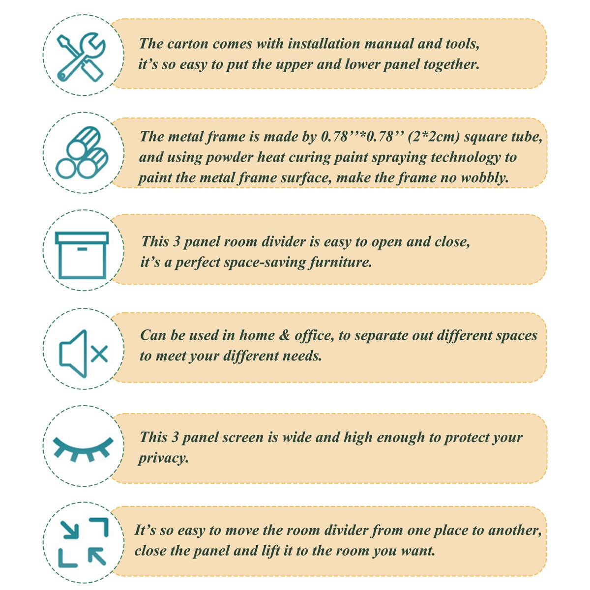 - Ce séparateur de pièce est conçu pour être autonome et ne nécessite pas d'être appuyé contre un mur.