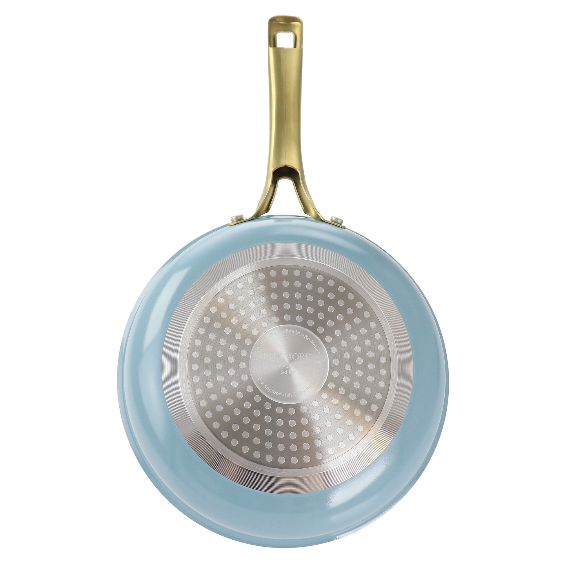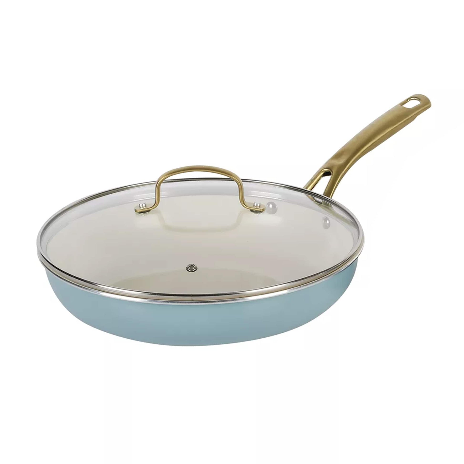 Devenez un chef exceptionnel avec cet ensemble de 3 poêles en aluminium antiadhésives et céramique. Cet ensemble comprend une poêle de 2,7 m et une poêle de 3,3 m avec couvercle en verre. L'intérieur antiadhésif en céramique permet aux aliments de glisser facilement, favorisant une cuisson faible en matières grasses et un nettoyage facile. La construction en aluminium épais et le fond pour induction assurent une répartition homogène de la chaleur pour une cuisson optimale. Cet ensemble, d'un bleu clair délicat et de magnifiques poignées dorées, sera du plus bel effet dans votre cuisine.