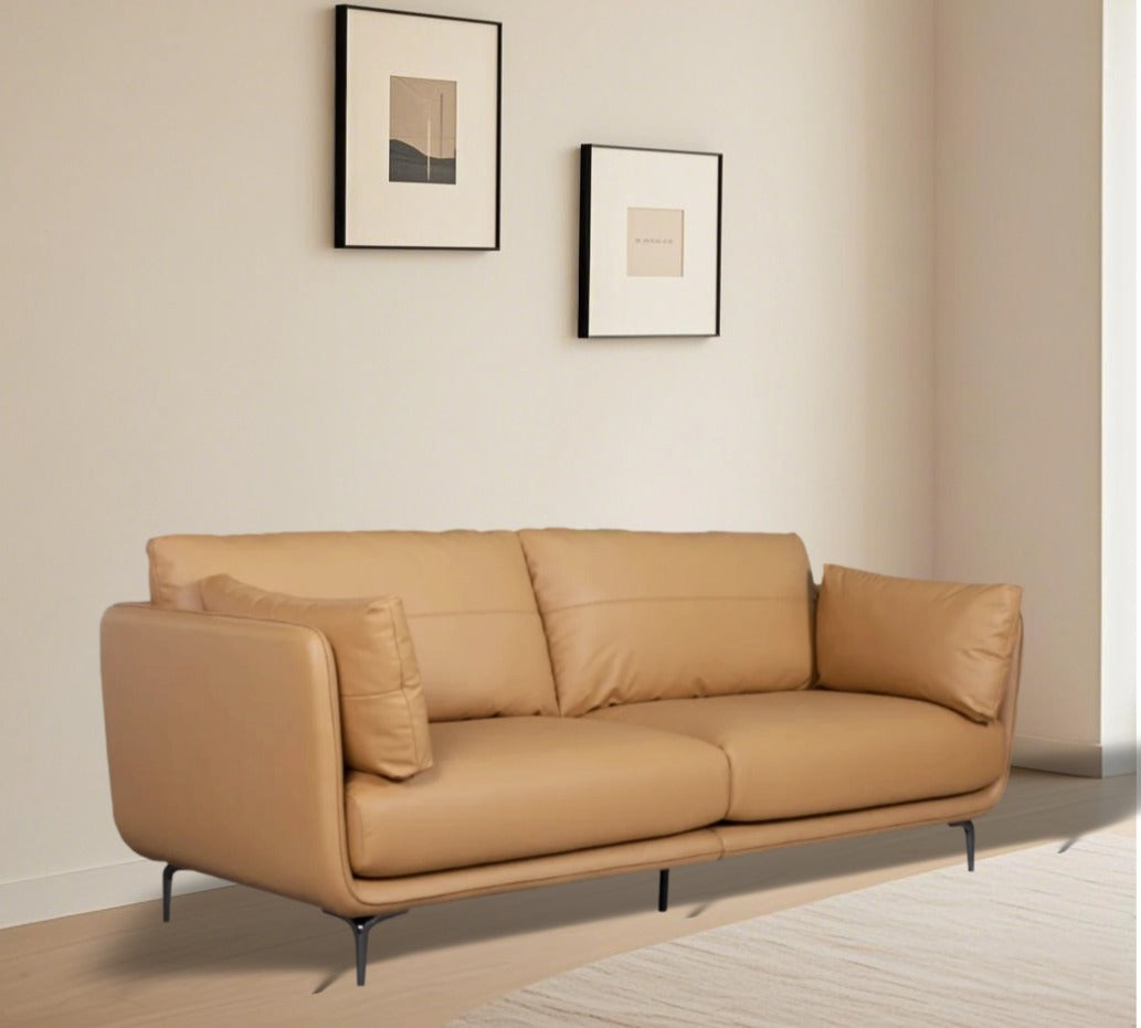Le canapé Ember dégage un charme moderne avec son revêtement en cuir caramel et ses bords légèrement arrondis. Ses coussins moelleux et ses pieds fins en métal noir allient confort et sophistication, ce qui en fait une pièce maîtresse accueillante des espaces de vie contemporains.
