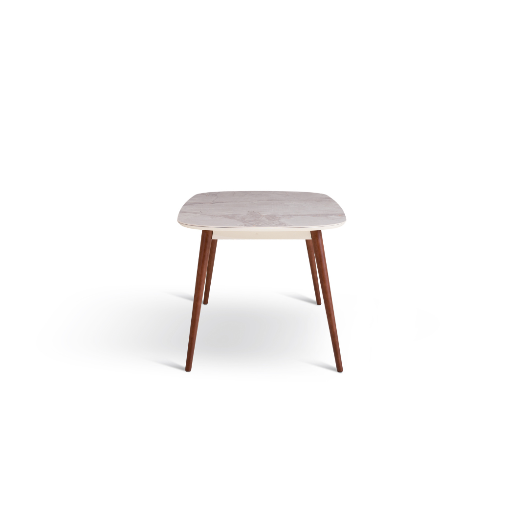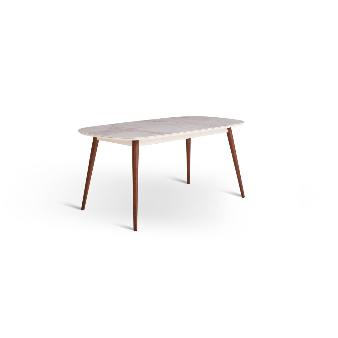 La table à manger Louis allie élégance et simplicité, avec son plateau lisse en faux marbre qui respire une sophistication intemporelle. Ses bords arrondis créent une esthétique douce et accessible, tandis que ses pieds fuselés en bois massif, aux tons chaleureux de noyer, offrent un soutien robuste et un charme des années 50.
