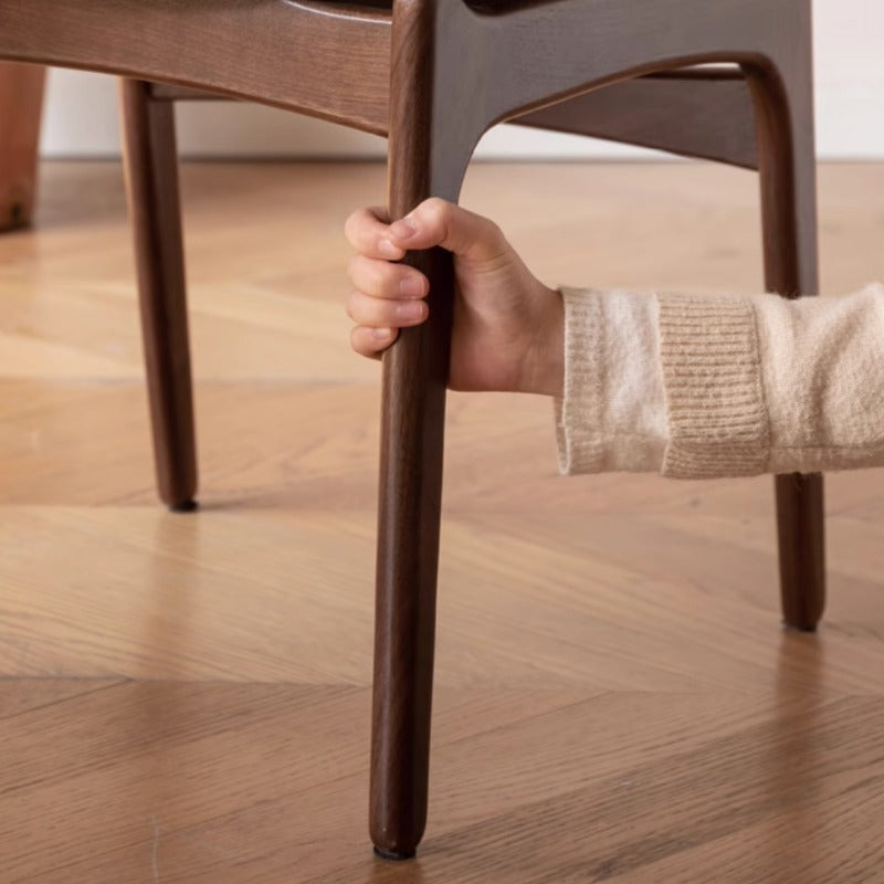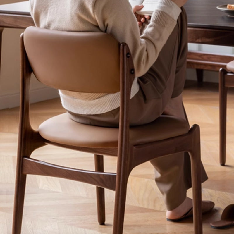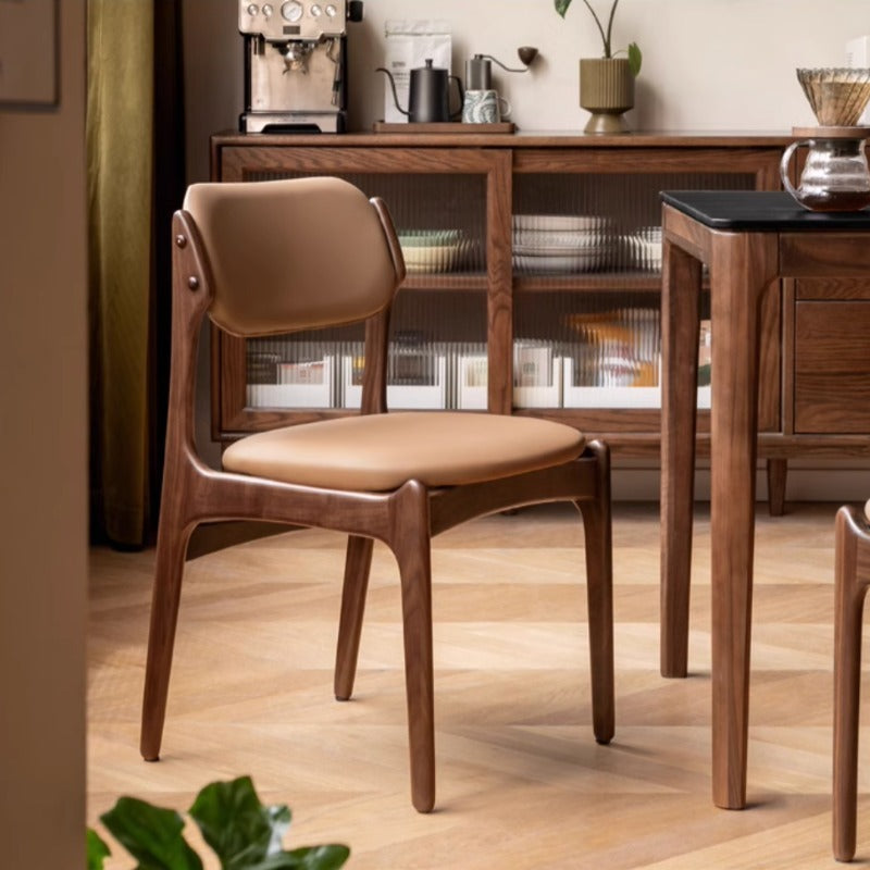 La chaise de salle à manger Miles en noyer allie savoir-faire raffiné et confort moderne. Fabriquée en noyer d'Amérique du Nord, elle est dotée d'un large dossier et d'un revêtement en cuir organique résistant aux taches, ce qui la rend à la fois élégante et pratique pour les repas quotidiens.