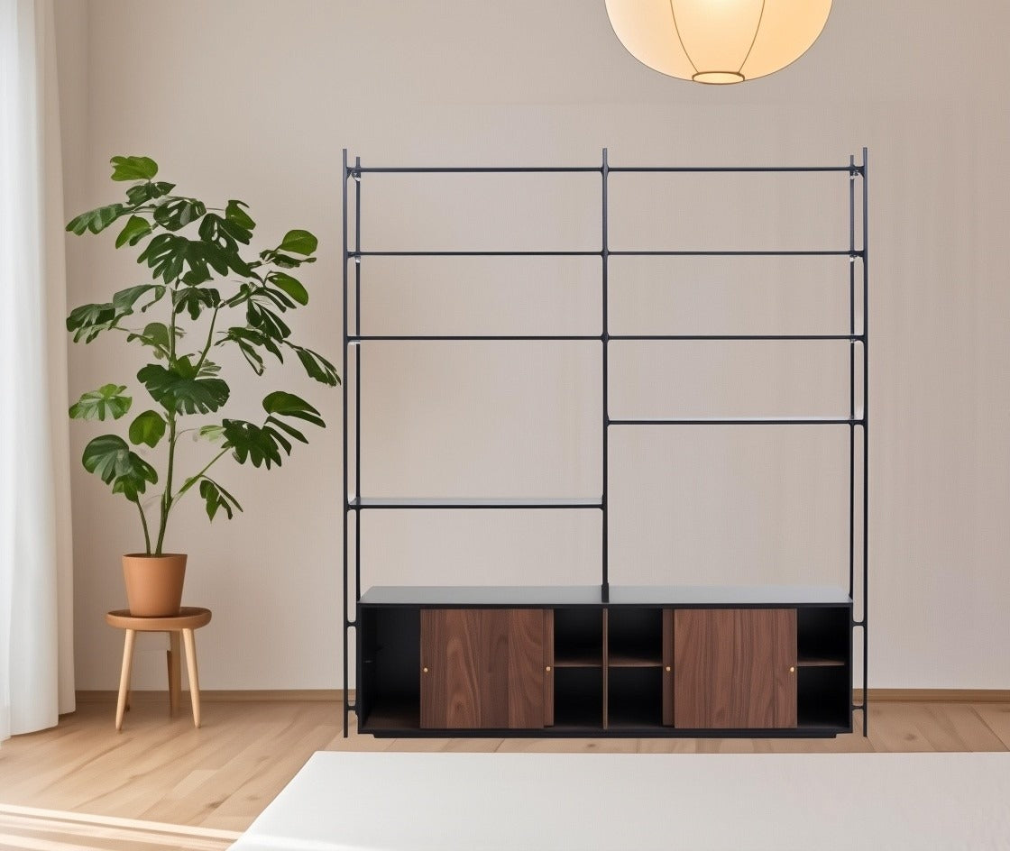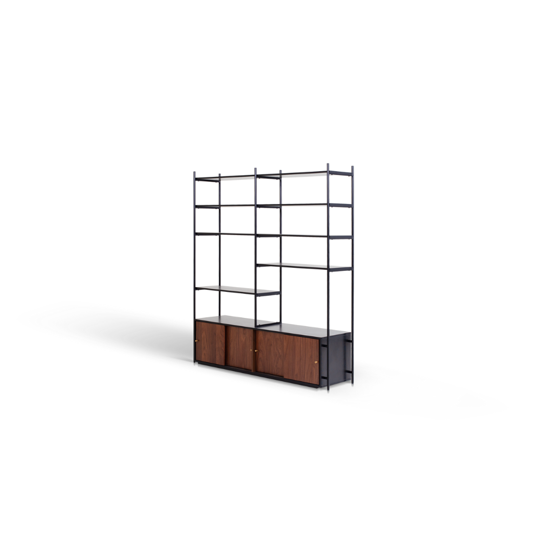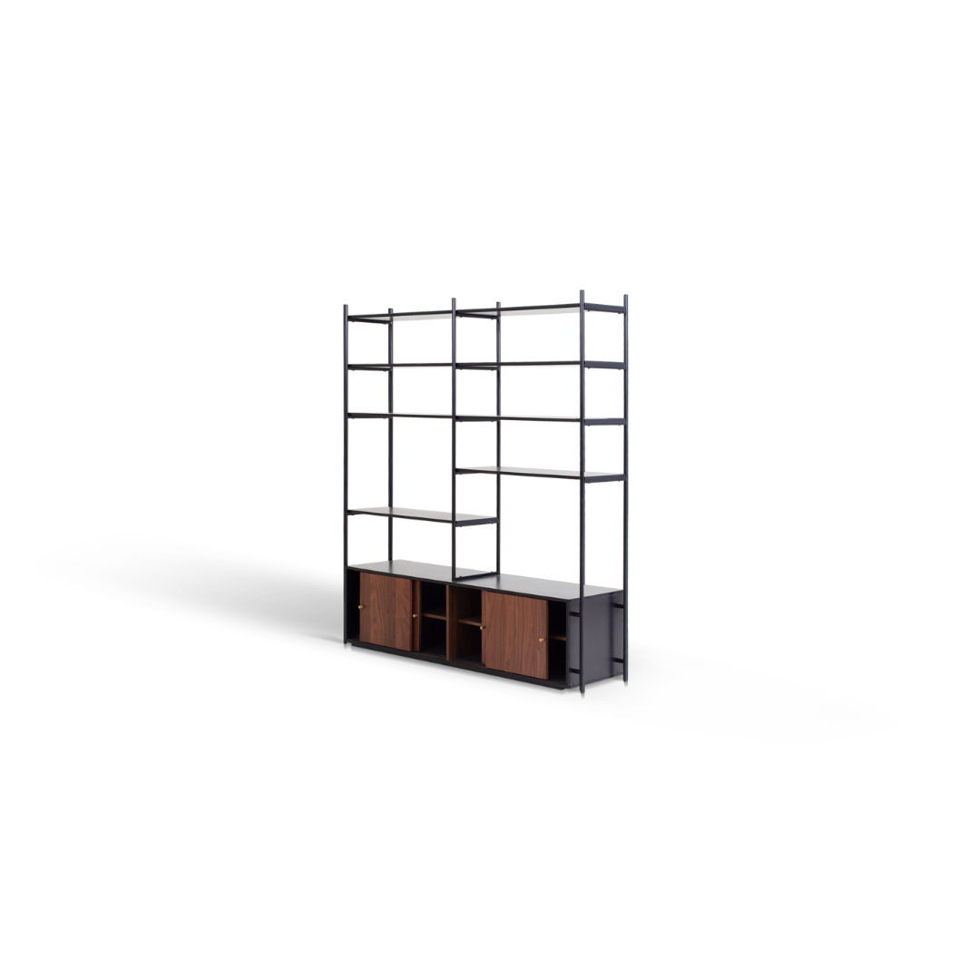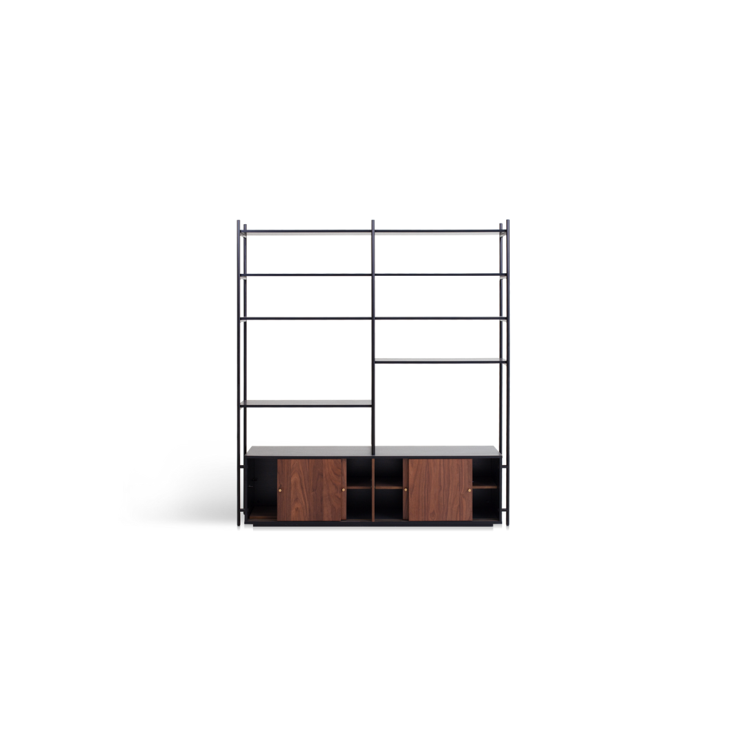 La bibliothèque Nova allie étagères ouvertes et rangements dissimulés pour une solution élégante et polyvalente. Son élégant cadre en métal noir apporte structure et contraste, tandis que les portes en noyer apportent chaleur et élégance.