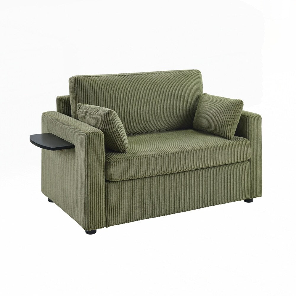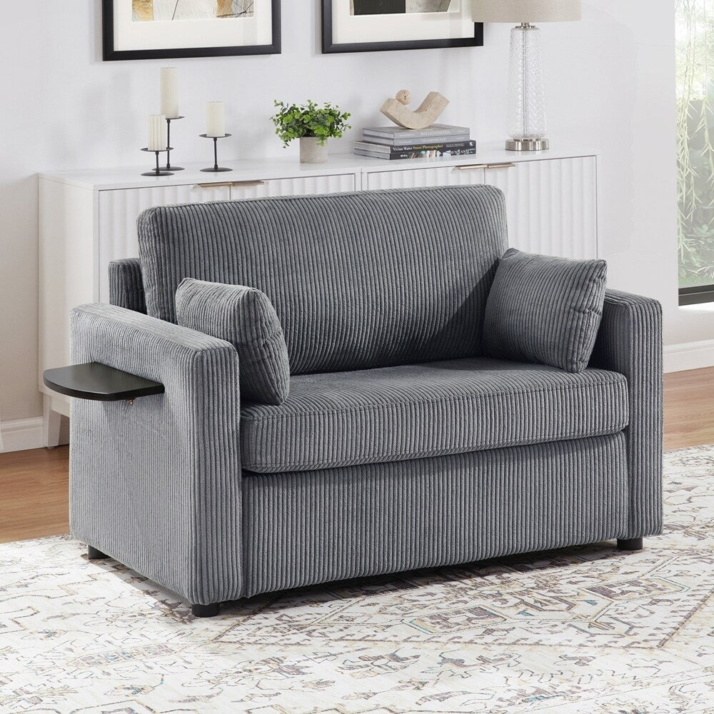 This twin-size convertible sleeper sofa is a stylish and practical solution for compact living spaces. It seamlessly transforms from a sofa chair into a comfortable bed, making it ideal for apartments, guest rooms, or dorms. Thoughtfully designed features include a foldable side table for added convenience, built-in USB charging ports, and a handy side storage pocket to keep essentials within reach. Two supportive lumbar pillows enhance both comfort and visual appeal, making this multifunctional piece perfect for lounging, working, or hosting overnight guests.