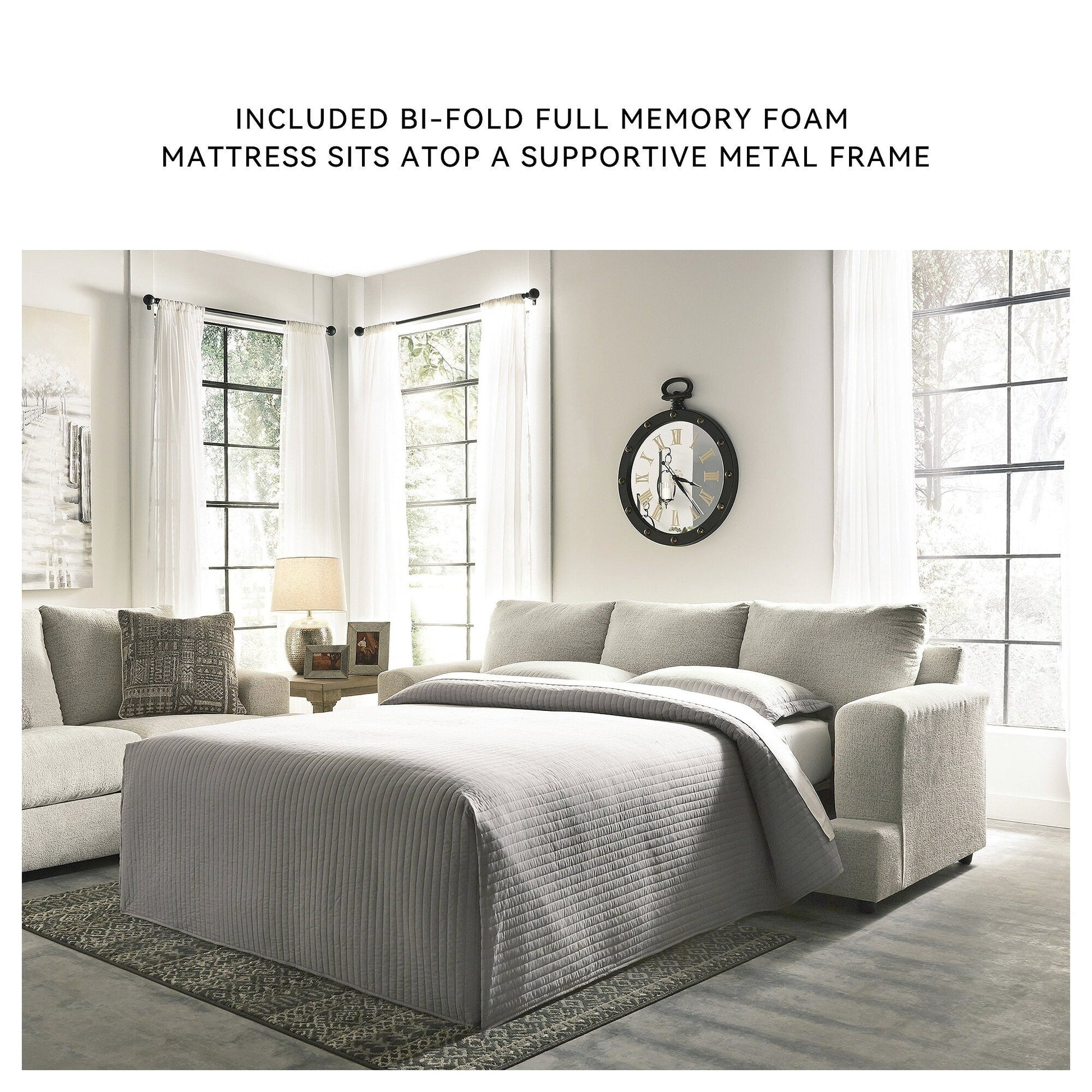 Flaunting a trendsetting silhouette, this sofa sleeper puts the contemporary in your contemporary home. Its 'three over two' profile eliminates the center seat cushion, giving you elongated plushness and deep seating. Chunky chenille fabric satisfies your need for a piece that feels as good as it looks. Accented with soft jacquard chenille throw pillows for a splash of geometric pattern and color contrast. Pull-out queen mattress in quality memory foam comfortably accommodates overnight guests.