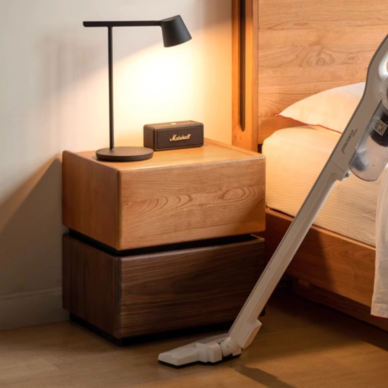 La table de chevet Milo Block est une pièce à la fois audacieuse et raffinée qui apporte contraste et chaleur à votre chambre. Fabriquée en cerisier et noyer noir de première qualité, ses tons naturels forment un design en bloc saisissant, à la fois fonctionnel et artistique.