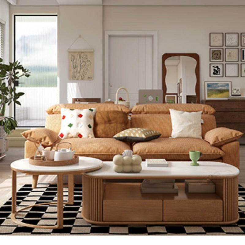 L'ensemble de tables basses Sophie en pierre frittée allie chaleur naturelle et élégance moderne. Fabriqué en bois massif avec des panneaux verticaux et recouvert d'une surface en pierre frittée durable, cet ensemble allie style intemporel et praticité au quotidien. Son élégant plateau en pierre blanche est résistant à la chaleur, aux rayures et facile d'entretien, ce qui le rend idéal pour les salons familiaux.