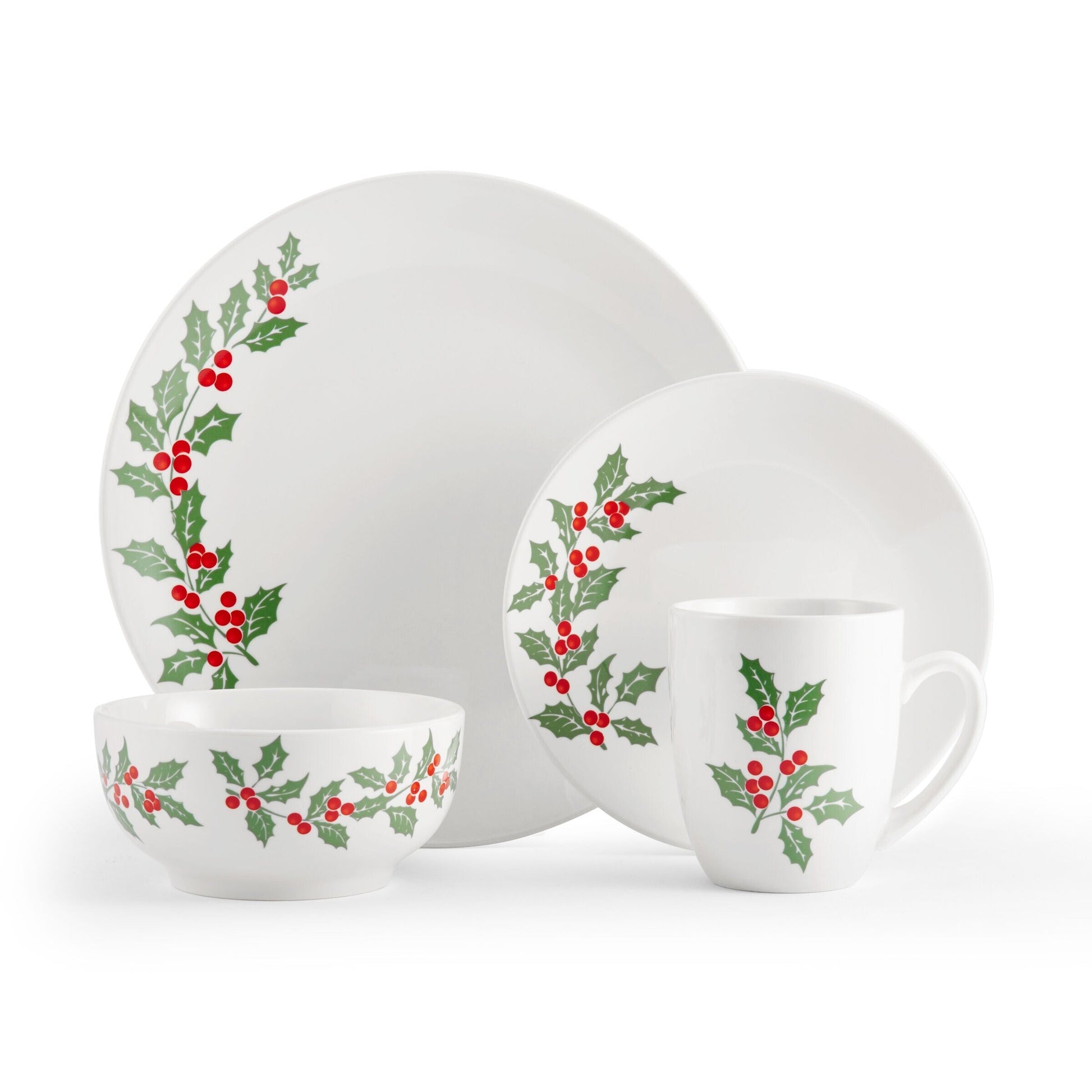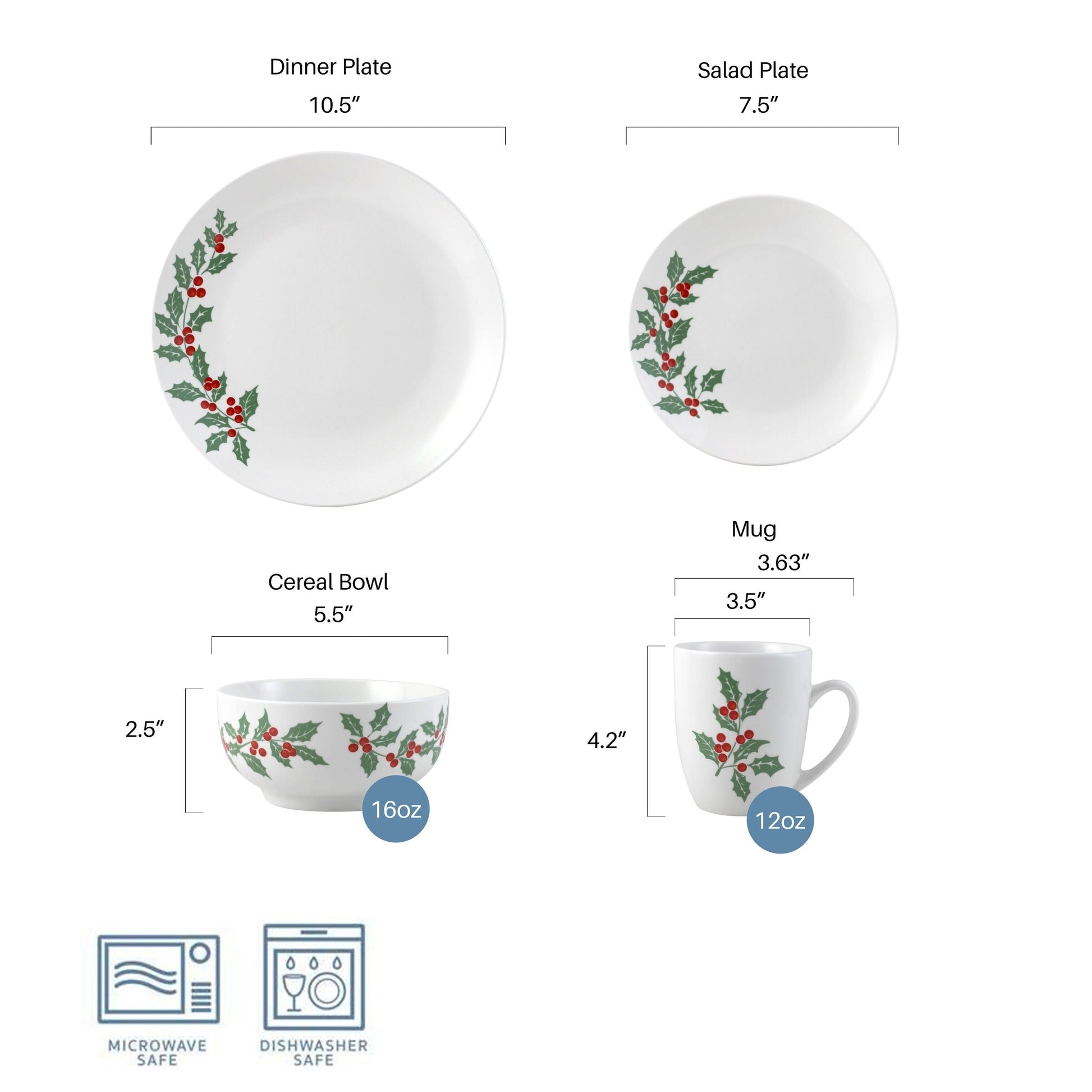 Ce service de table Studio Nova 16 pièces « Holly Cheer » célèbre avec éclat les fêtes, avec ses branches de houx vert et ses baies rouges dansant sur des pièces blanches en forme de coupe. Fabriqué en porcelaine, ce service festif est parfait pour les réunions informelles et les repas quotidiens tout au long de la saison. Ce service de 16 pièces pour 4 personnes comprend : une assiette plate de 26,5 cm, une assiette à salade de 19,5 cm, un bol tout usage de 14,5 cm (47 cl) et une tasse de 9,5 cm (35 cl). Compatible micro-ondes et lave-vaisselle.