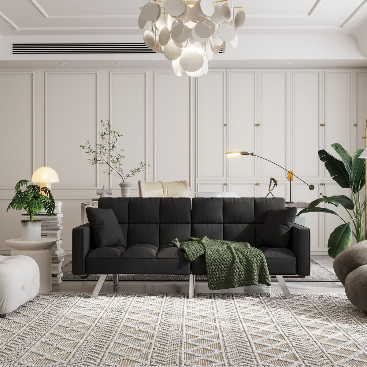 Upgrade your small space living with this stylish and versatile Velvet Sofa Couch Bed. With armrests and 2 pillows, this loveseat sofa bed helps you create the perfect environment for both work and relaxation. The adjustable back easily converts this sofa into a comfortable bed, making it a great solution for overnight guests. The split-back design allows for multiple lounge positions, accommodating personal preference. Crafted with high-quality velvet fabric and chrome metal legs, this sofa bed provides both comfort and durability. Plus, assembly is a breeze with the included detailed instructions.