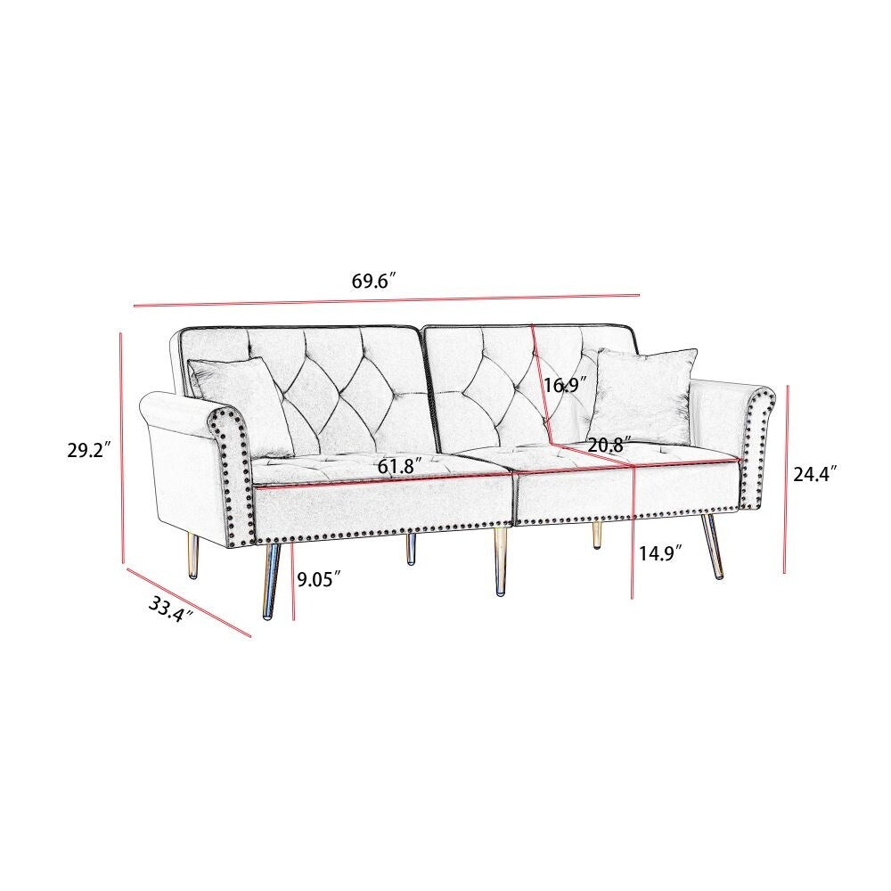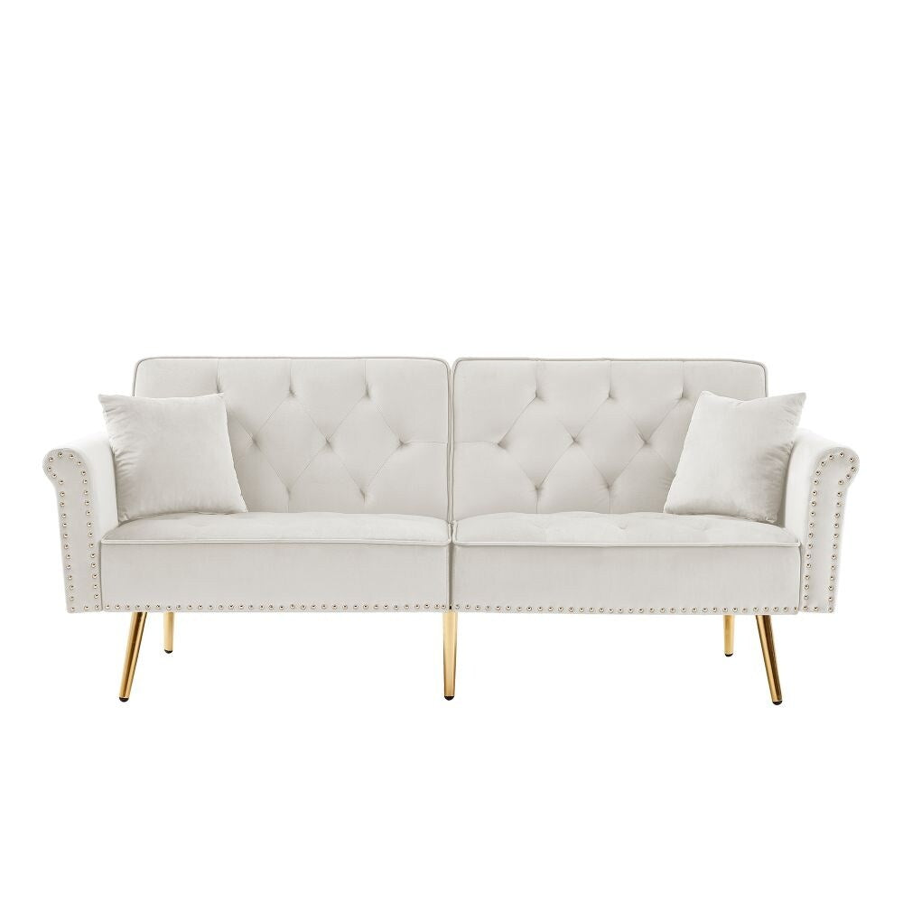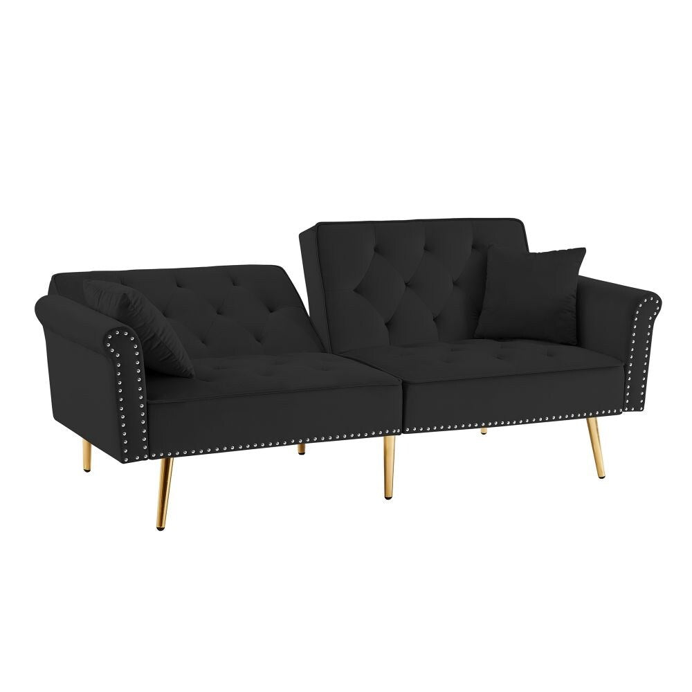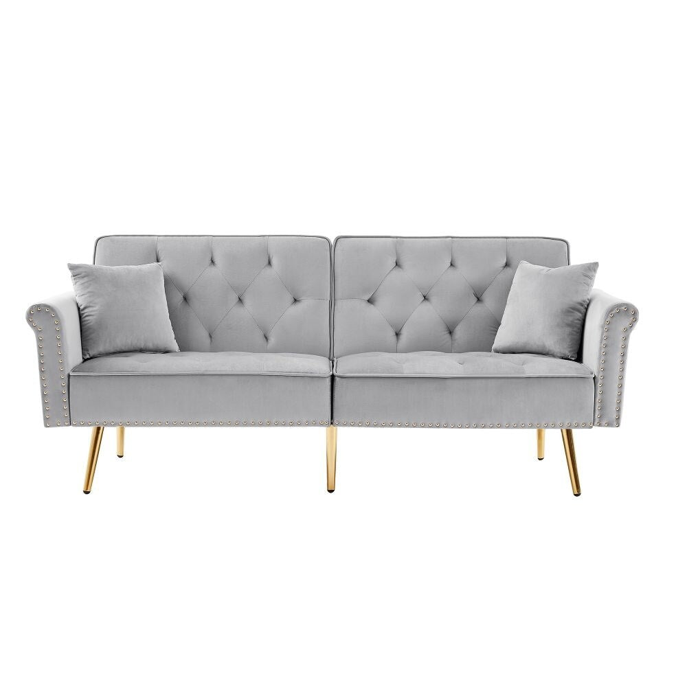 Canapé capitonné en velours avec 2 coussins et garniture cloutée