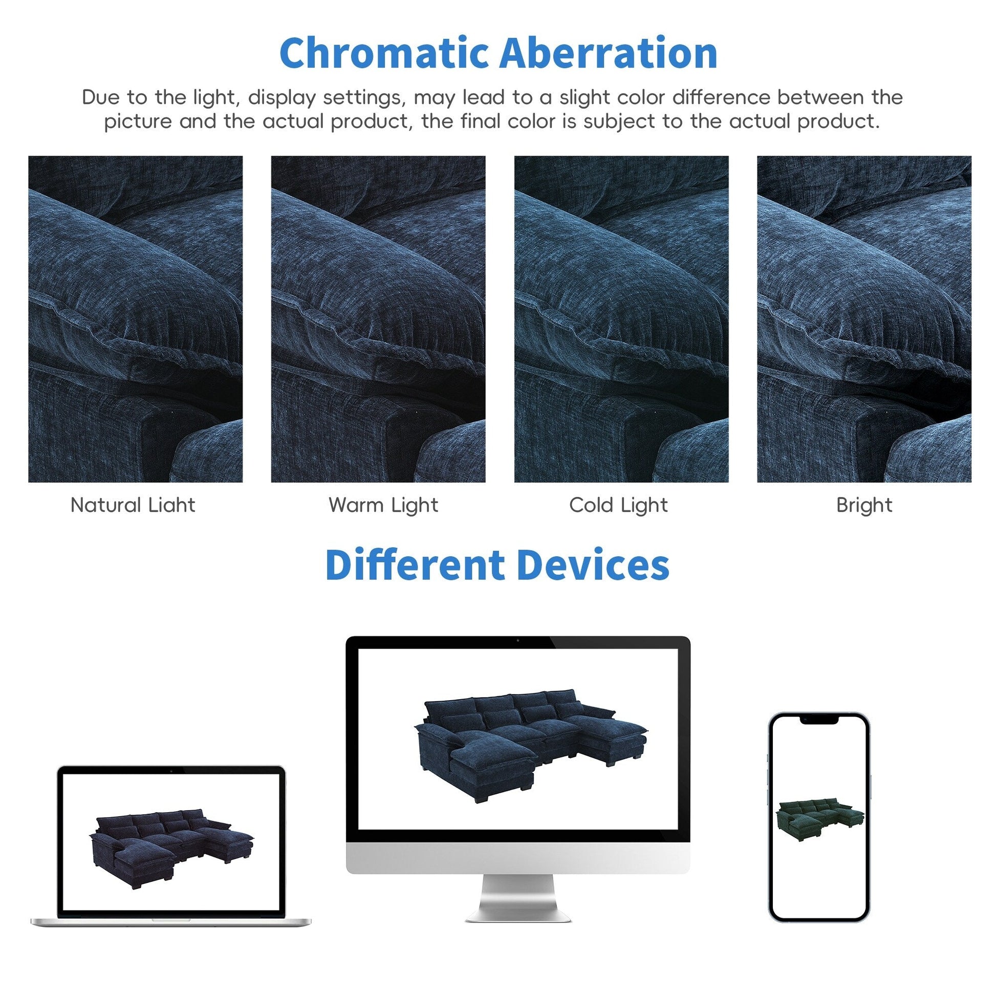 Double chaise lounge: It can relax our head, neck, back and all parts of the body, making it more comfortable than traditional sofas. Double cushion: Provide a softer and more comfortable wrap-around feeling.The top cushion is filled with pure high density foam for a softer feeling,the lower cushion is filled with pocket springs with high density foam for better support. High-Quality: The sofa features a sturdy wood and iron frame that can hold up to 330 lbs, making it unencumbered for everyday use. It is also equipped with solid wood legs, which are stable and durable, not easy to scratch the floor. Comfortable design: The white sofa is made of high-quality chenille, which is soft, comfortable and durable.Armrest pockets on both sides of the sofa can relax your head, and there are also 4 lumbar pillows to give better lumbar support, making it easy to adjust your posture and reduce discomfort and fatigue. Stylish Style: The upholstery and sleek lines blend make this combination sofa beautiful and comfortable, perfect for your apartment, house or conference room. This U-shaped Modular sofa is suitable for any indoor environment, embracing your friends and giving a comfortable and cozy feeling!