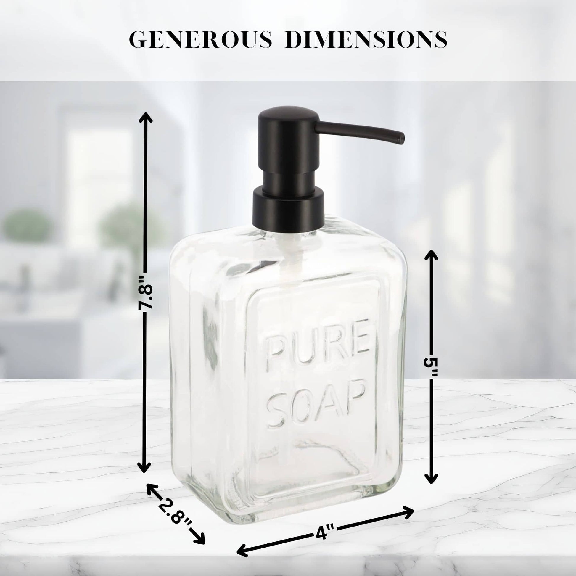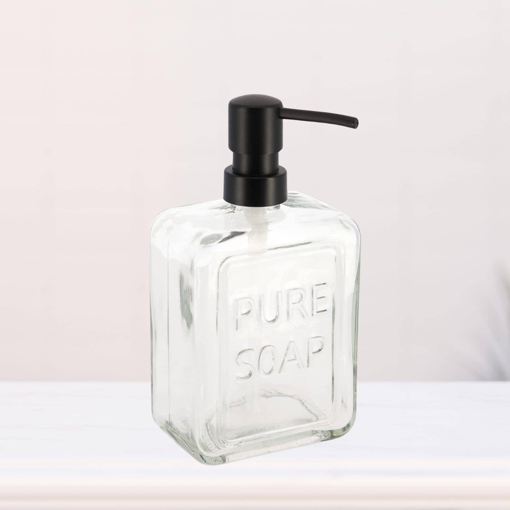 - DESIGN ÉLÉGANT : La forme angulaire de ce distributeur de savon transparent rappelle celle d'un savon traditionnel. La gravure « Pure Soap » sur le flacon, associée à l'embout noir de la pompe, complète son design moderne.