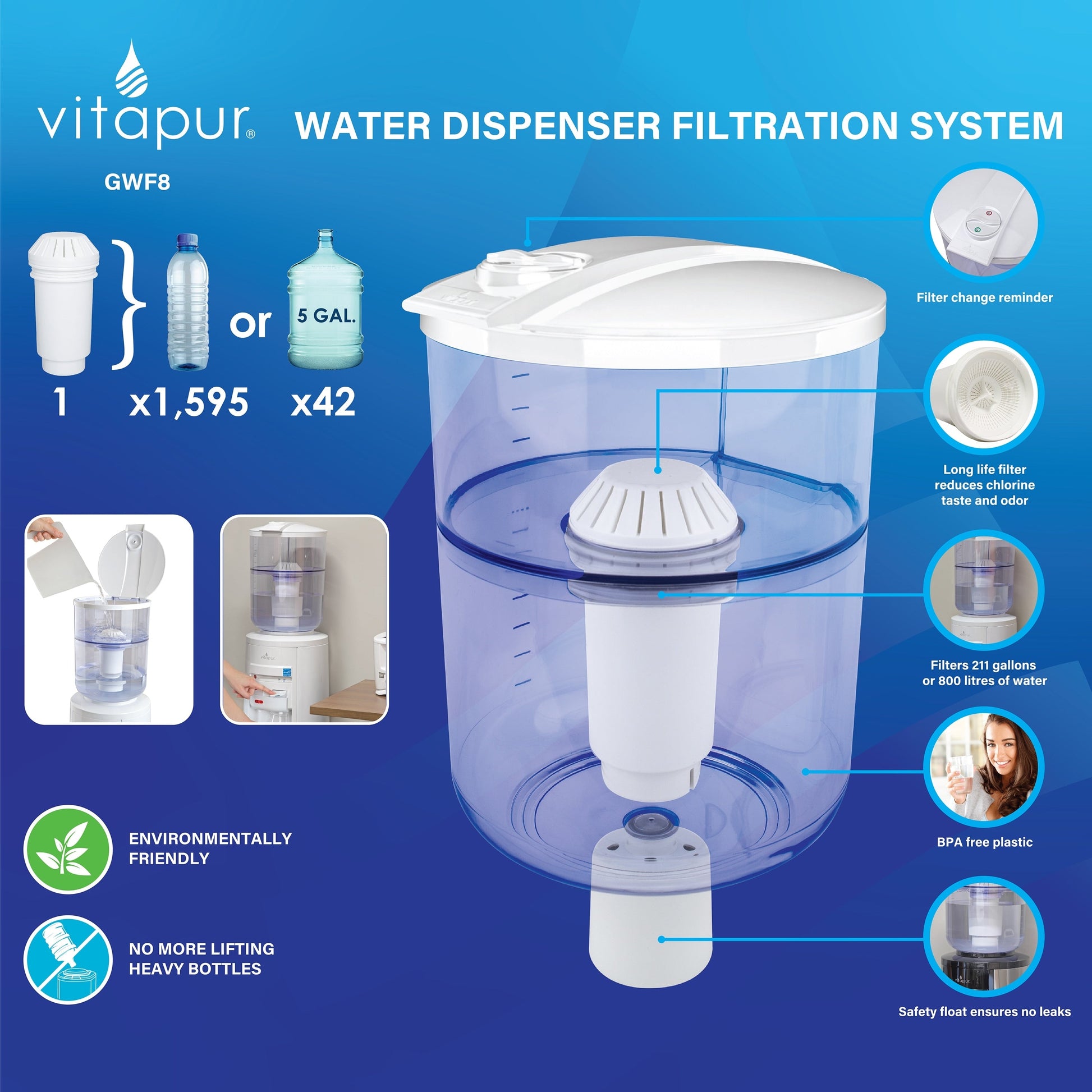 Améliorez votre fontaine à eau et faites des économies grâce à ce système de filtration écologique. Profitez du goût pur et cristallin d'une eau filtrée sans acheter de bouteilles. Ce système de filtration est certifié NSF 42 pour réduire les particules, ainsi que le goût et l'odeur de chlore. Ce système breveté est compatible avec les fontaines à eau Vitapur® à chargement par le haut et la plupart des fontaines à eau standard, vous permettant ainsi d'obtenir facilement une eau pure et au goût pur.