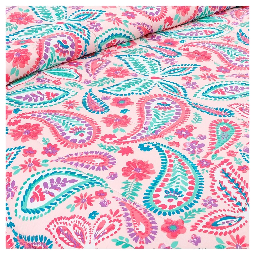- Parure de lit réversible à motif floral rose, violet, menthe, aqua et blanc