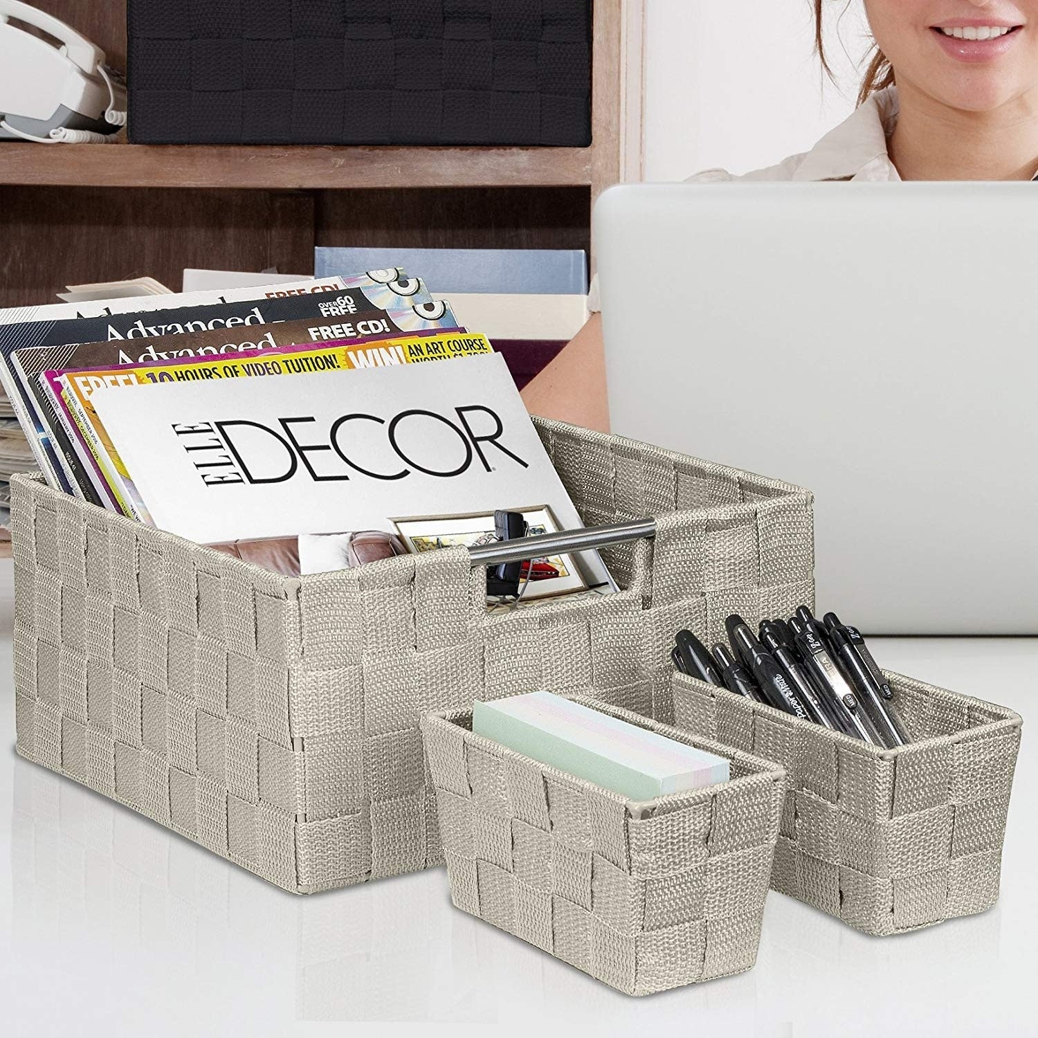 L'ensemble de paniers Sorbus offre une solution décorative pour organiser votre espace. Il comprend 7 paniers de différentes tailles pour ranger et exposer vos essentiels. Les grands paniers accueillent livres, magazines, couvertures, DVD et bien plus encore, tandis que les petits paniers accueillent produits de voyage, accessoires, fournitures de bureau et petits objets. Pour un transport facile, utilisez les poignées latérales pour soulever ou déplacer chaque panier dans la maison, que ce soit pour le rangement ou l'exposition. Conçu avec un motif tressé classique, cet ensemble apportera une touche d'élégance à votre organiseur cubique, à votre étagère, à votre sol ou à votre table.