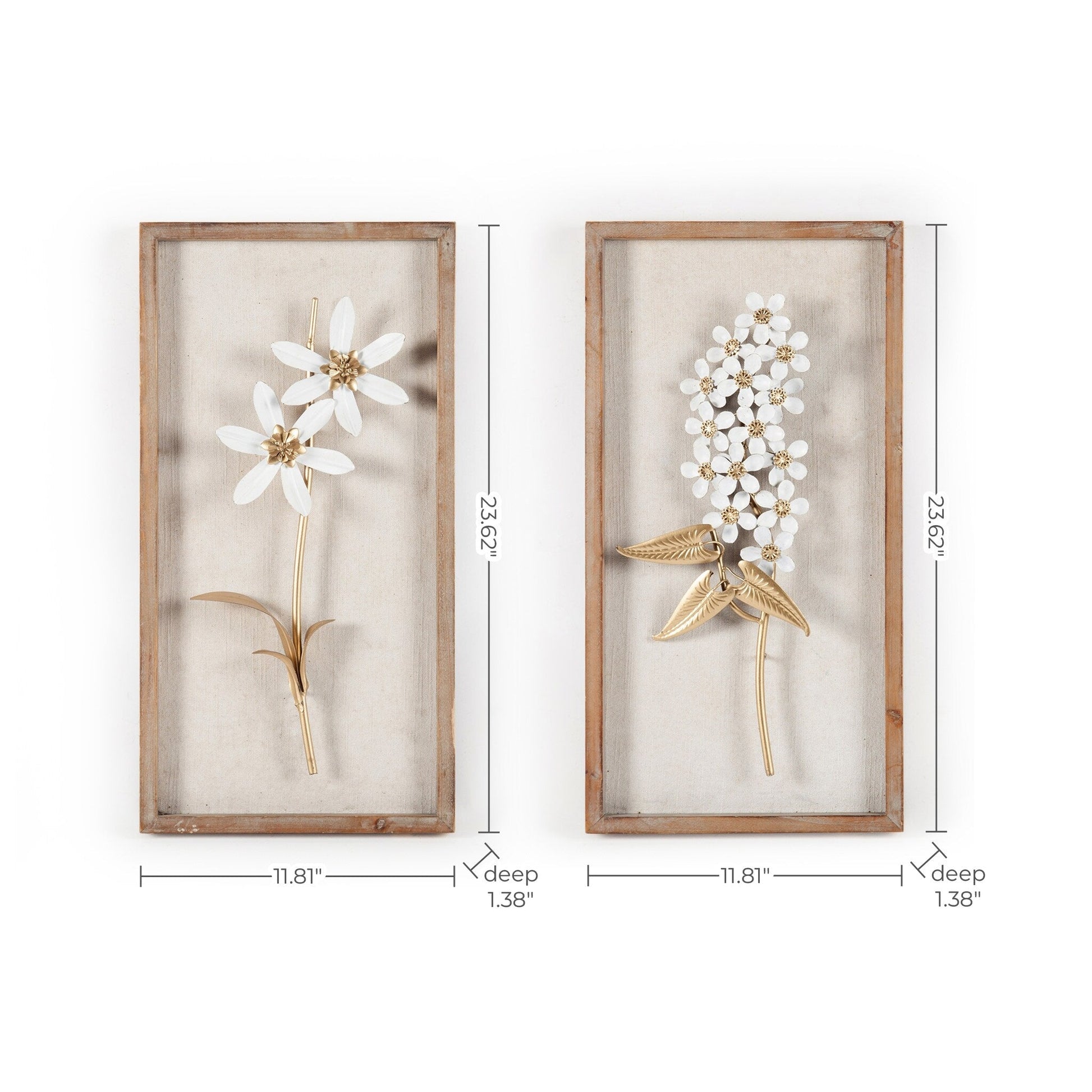 Décoration murale avec cadre en bois et bouquet de fleurs en métal blanc et doré (lot de 2)