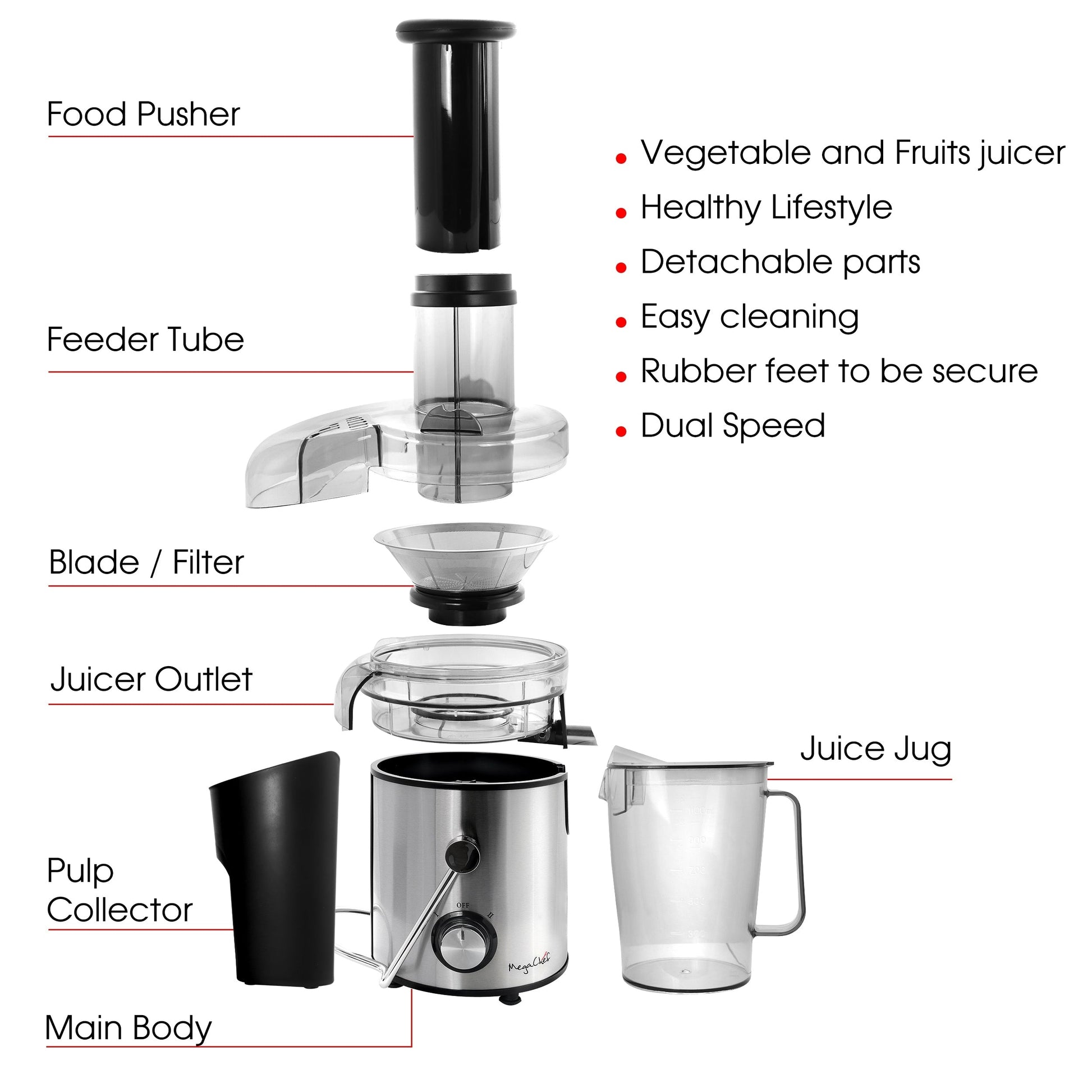 L'extracteur de jus est un appareil indispensable dans tous les foyers. Ce puissant extracteur de jus extrait les nutriments, vitamines et minéraux essentiels des fruits et légumes. Avec son moteur de 800 W, extraire du jus n'a jamais été aussi simple. Il dispose de deux modes de vitesse : la vitesse lente « I » pour les fruits et légumes tendres et juteux comme la pastèque, l'orange, le raisin, le céleri et le concombre ; la vitesse rapide « II » pour les fruits durs comme la pomme, la poire, la carotte, la betterave, le gingembre et le chou frisé. Cet appareil est très facile à nettoyer. Équipé d'un récipient à jus de 90 ml et d'un récupérateur de pulpe de 110 ml, il vous permet d'extraire le jus de vos fruits et légumes en une seule portion. Toutes les pièces amovibles de l'extracteur de jus vont au lave-vaisselle. L'extracteur est livré avec une brosse de nettoyage pour éliminer tout résidu de jus. Le bras de verrouillage de sécurité vous protège en garantissant que le couvercle est bien fermé pendant le fonctionnement. L'extracteur de jus comprend : un extracteur de jus double puissance de 800 W, un poussoir d'aliments, un tube d'alimentation, une lame/un filtre, une sortie d'extracteur de jus, un seau collecteur de pulpe (capacité de 4 tasses), un pichet à jus extracteur de jus (capacité de 3,5 tasses), un corps principal, une brosse de nettoyage. Les pièces amovibles vont au lave-vaisselle. Ne pas laver ni immerger le corps principal dans l'eau. Utiliser une serviette pour essuyer le corps principal. Dimensions : 17' x 16' x 7'. Diamètre du tube d'alimentation : 3,5'. Longueur du cordon : 3 pieds. Poids : 7,43 lb.